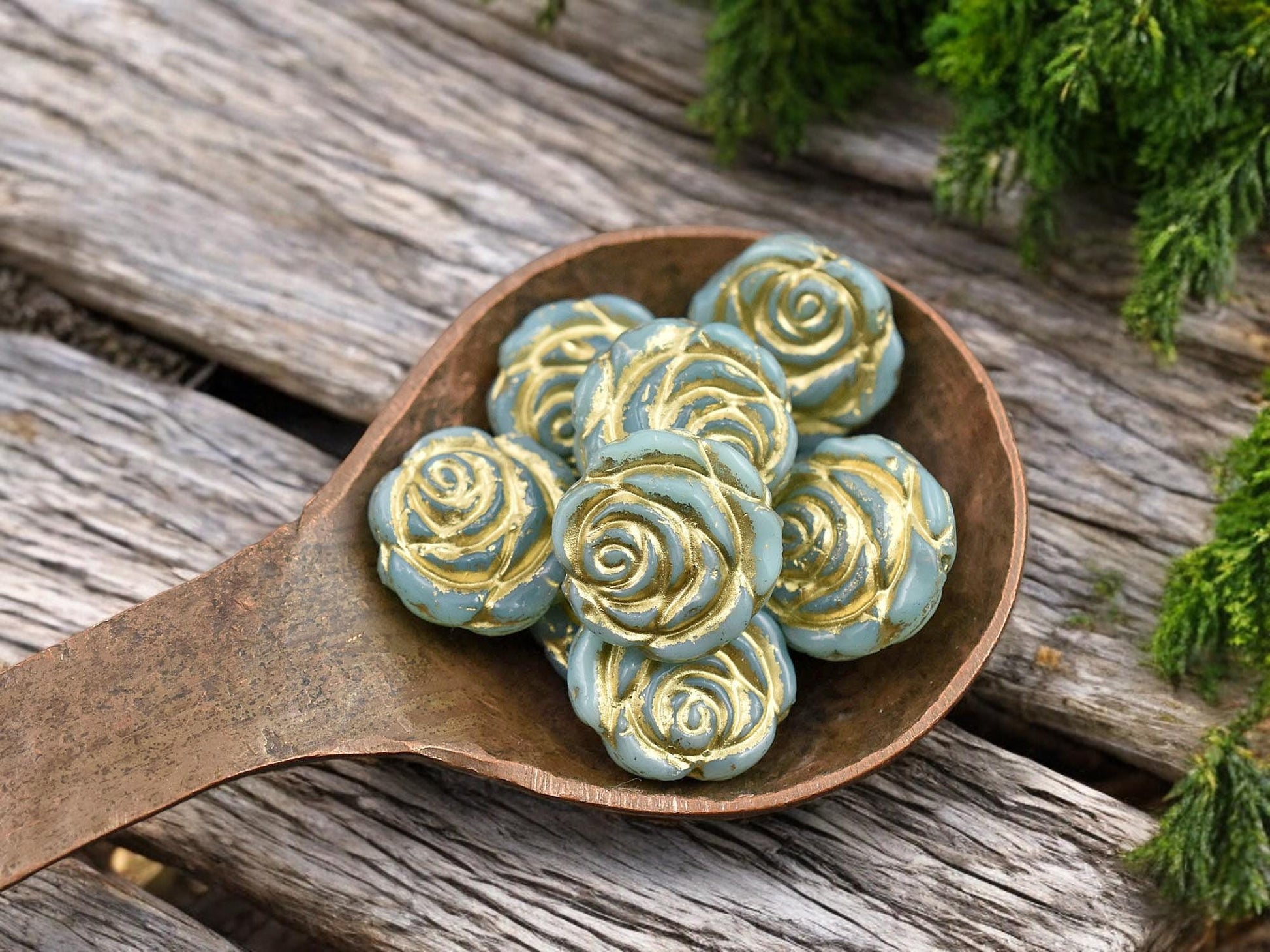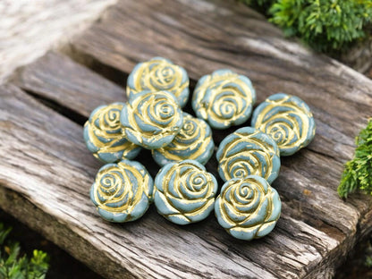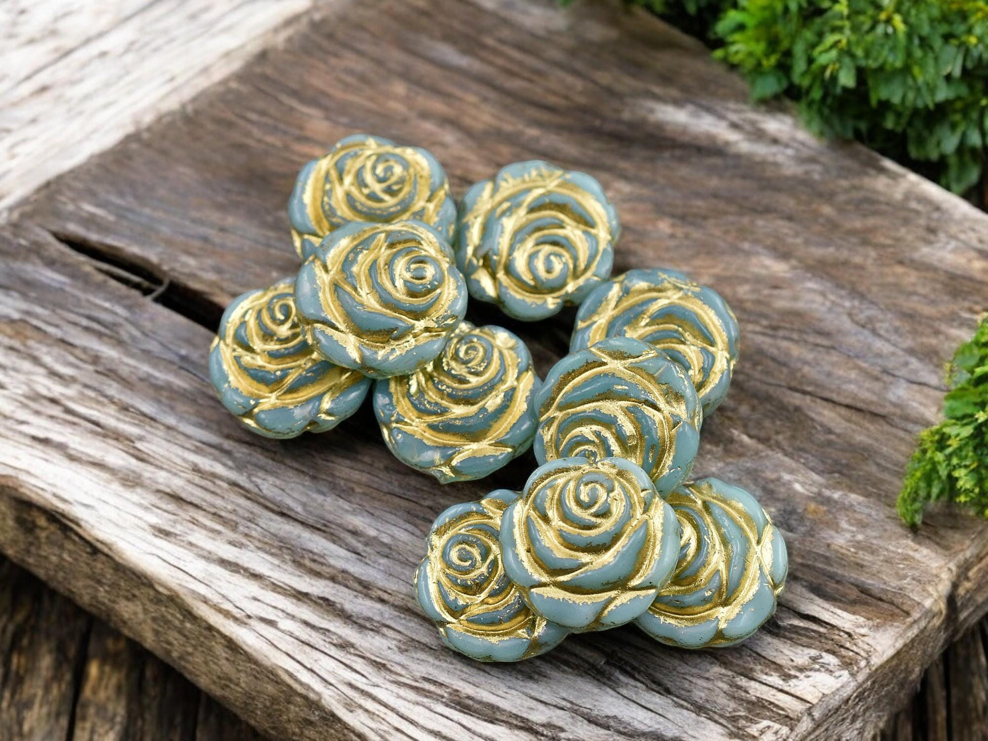 *10* 14mm Bronze Washed Aqua Opaline Rose Flower Beads