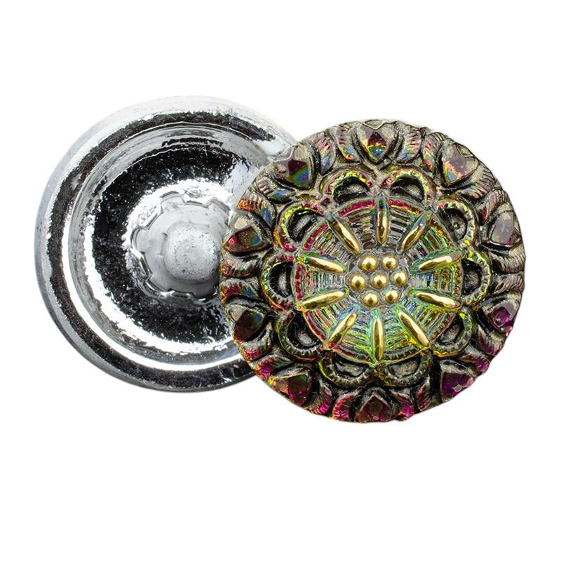 18mm Round Lacy Flower Pink and Green Iridescent Antiqued with Gold Paint - Czech Glass Buttons