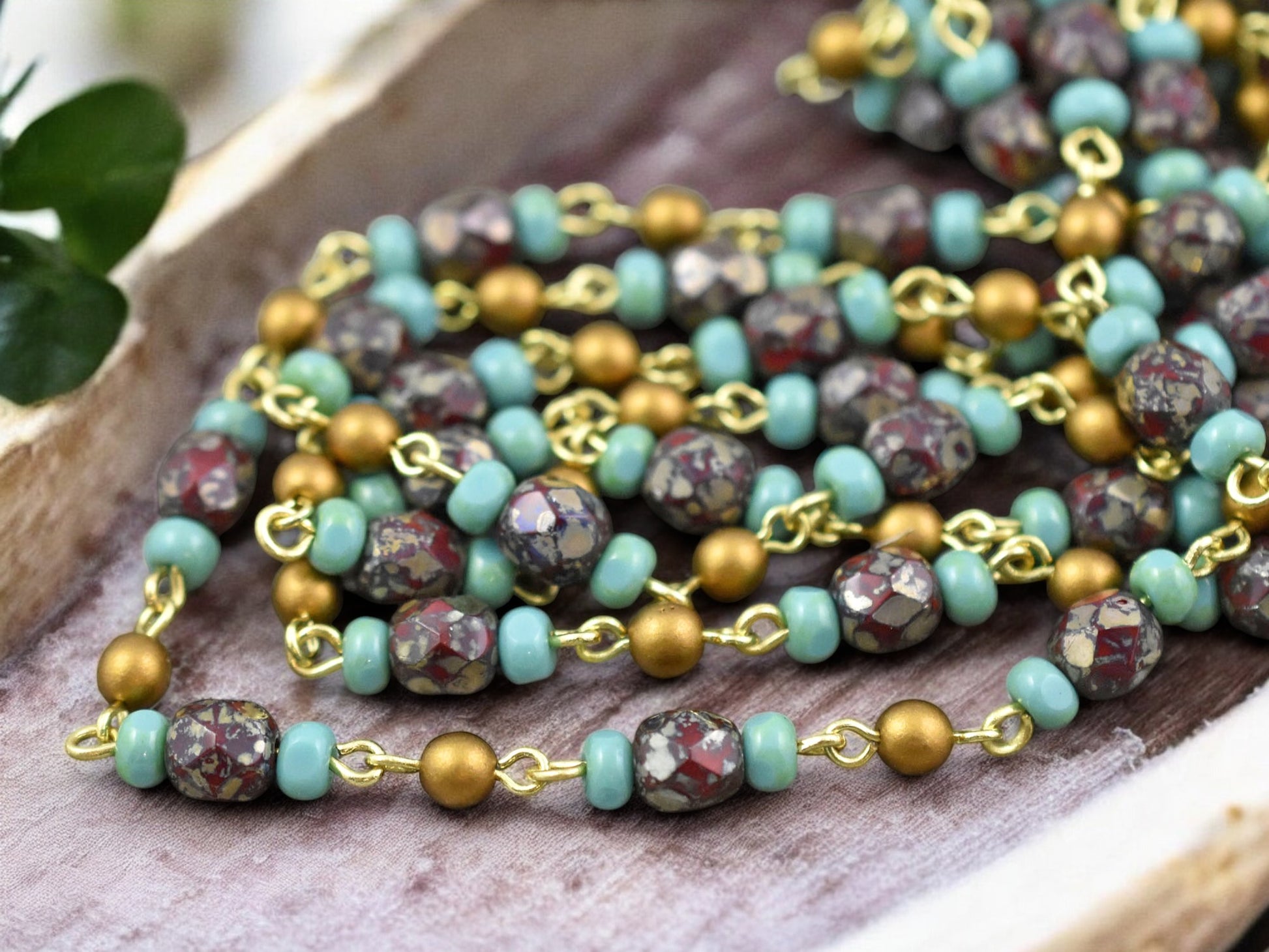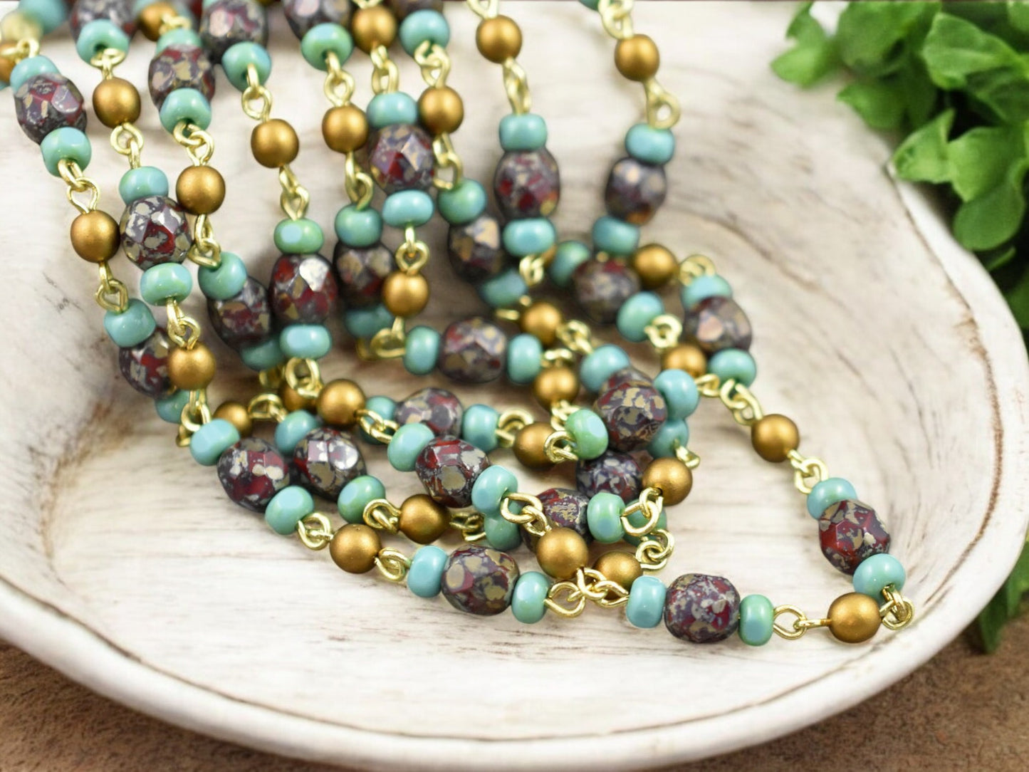 Czech Glass Southwest Blend Turquoise Tri Cut Beaded Chain with Gold Links -- Sold by the foot