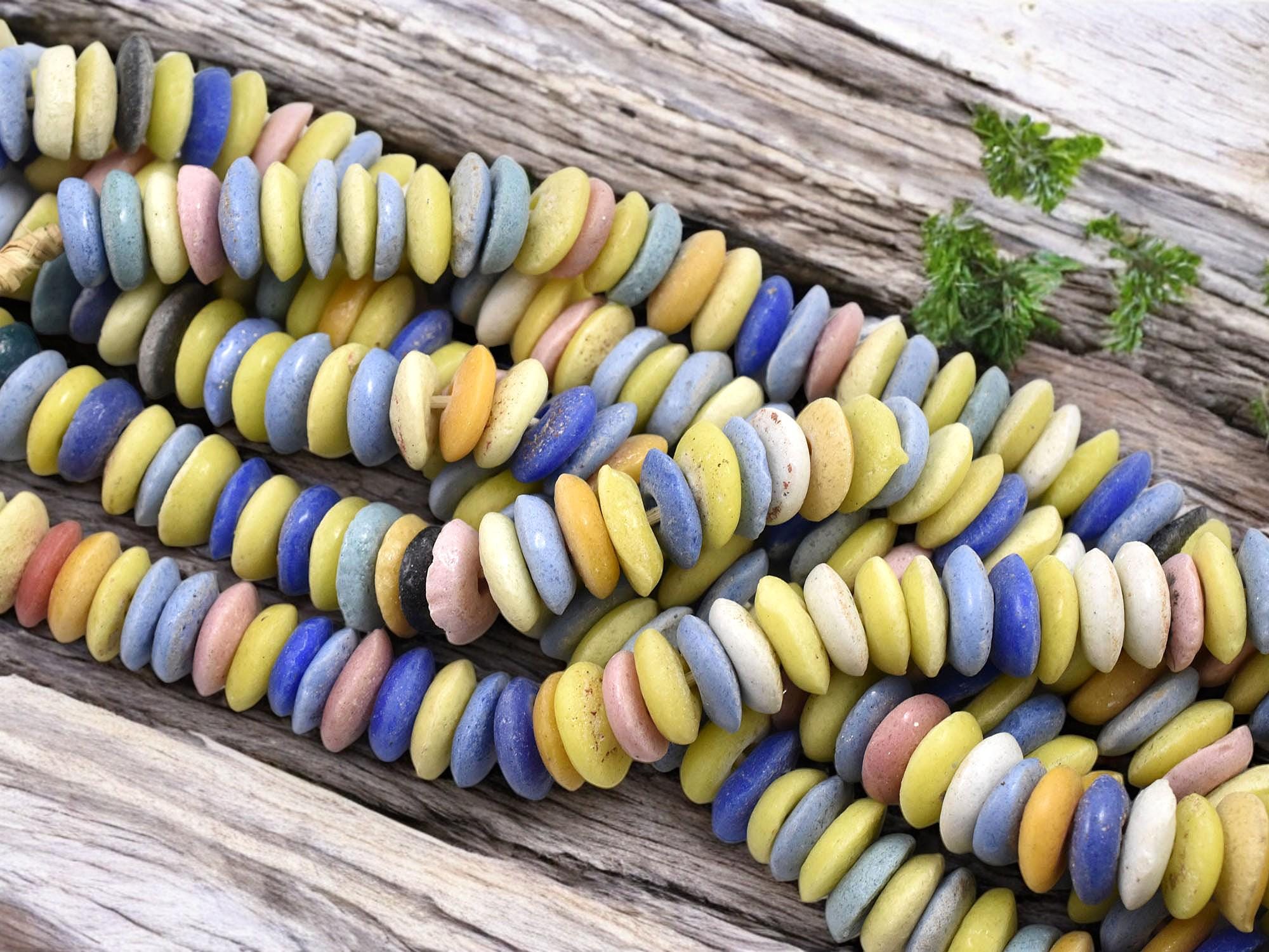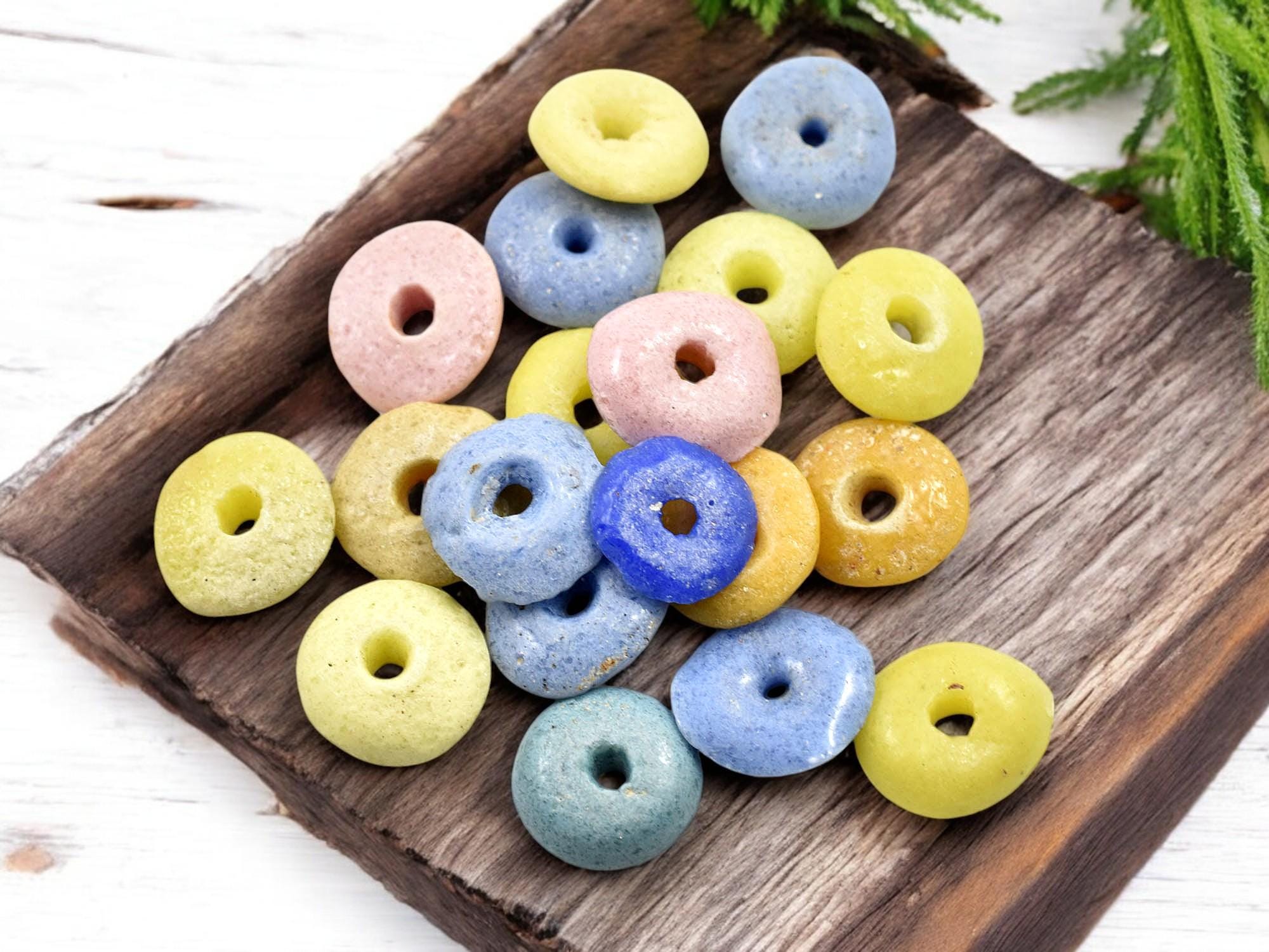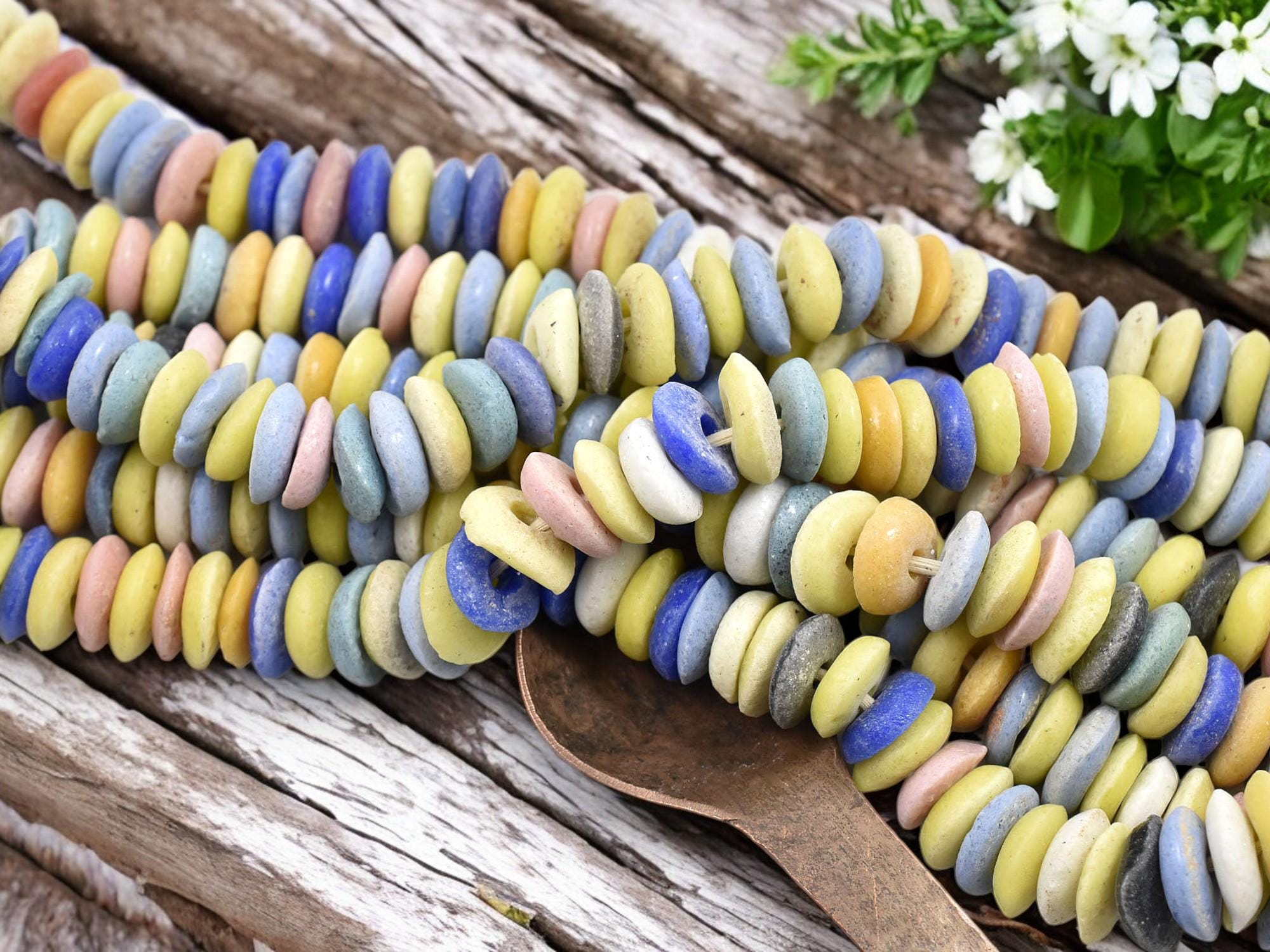 Add a vibrant touch to your jewelry and craft projects with these multicolored African recycled glass beads. Handmade using traditional techniques, these eco-friendly, donut-shaped beads feature a beautiful mix of earthy tones, including green, pink, blue, black, and orange. Perfect for creating boho, tribal, and rustic-style jewelry, bracelets, necklaces, and other DIY crafts. Each bead is unique, adding character and authenticity to your handmade creations. Order your high-quality African trade beads today!
