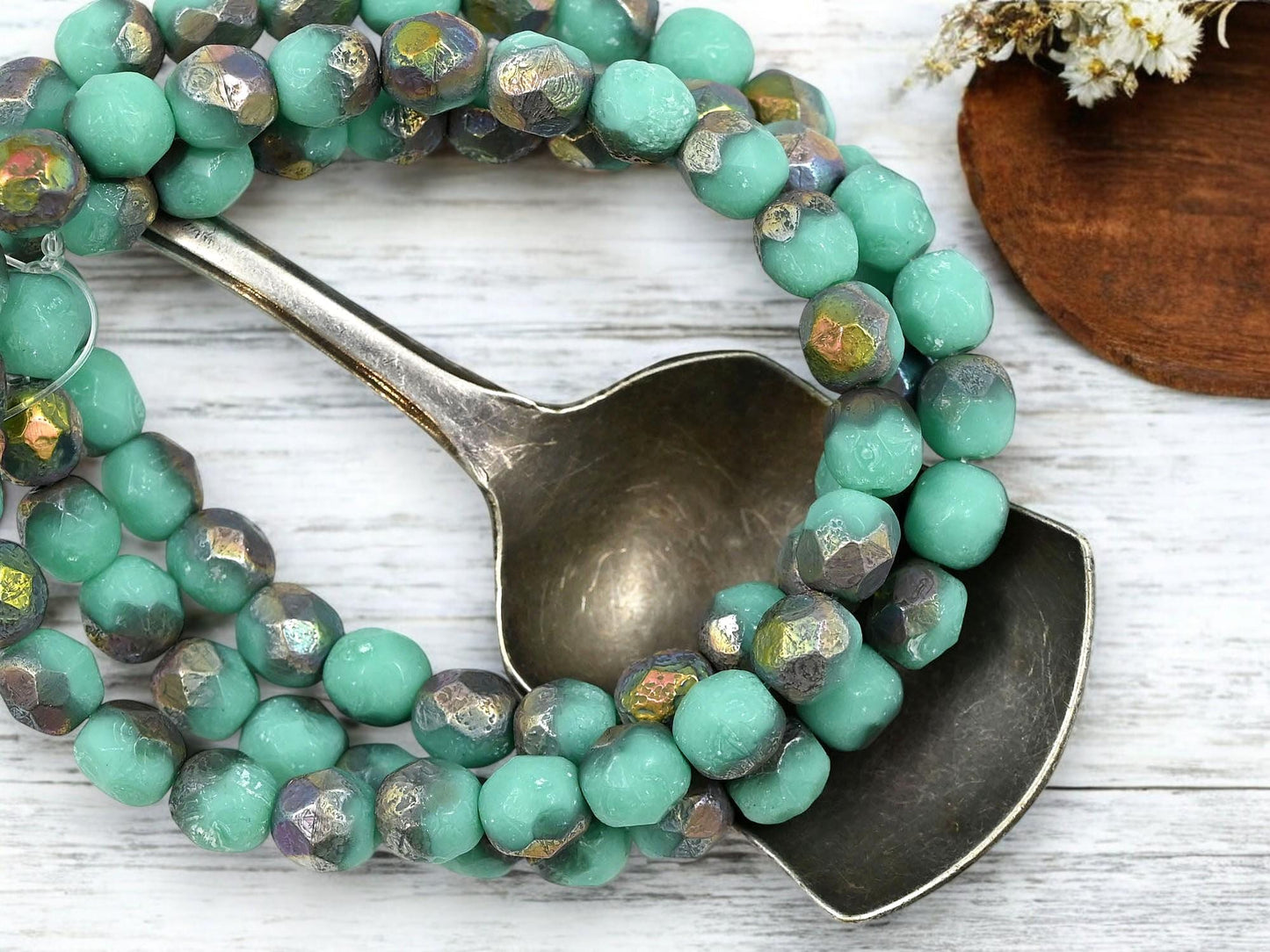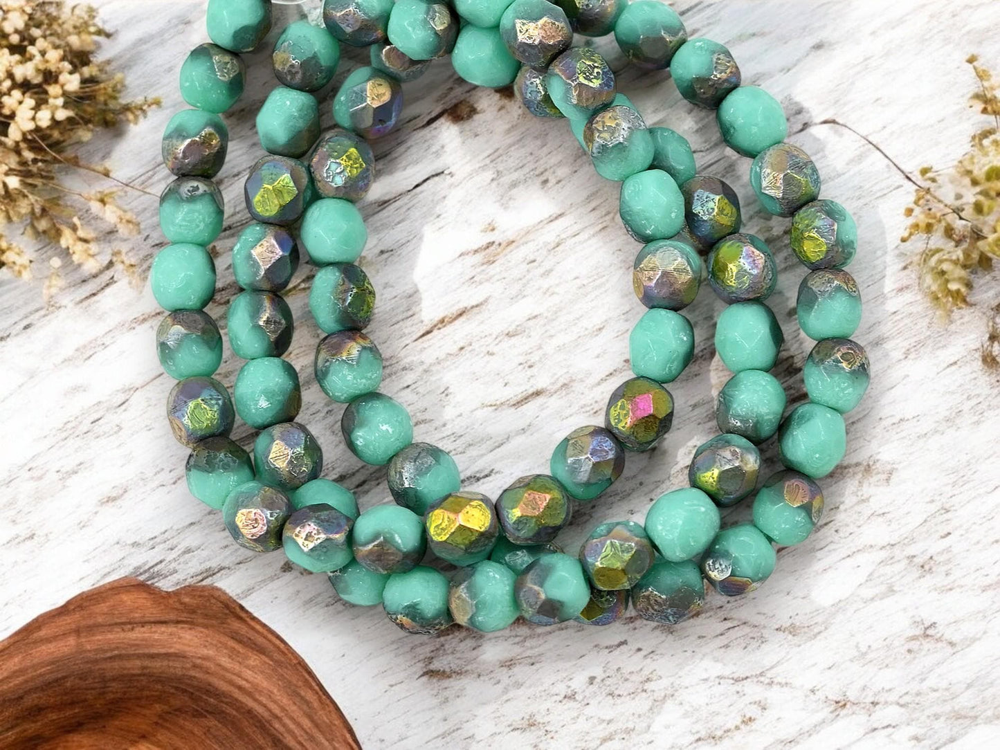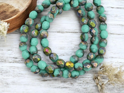Metallic Rainbow Etched Opaque Turquoise Fire Polikshed Round Beads - 4mm or 6mm