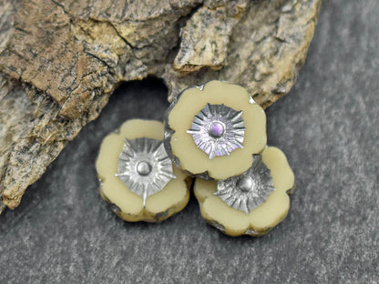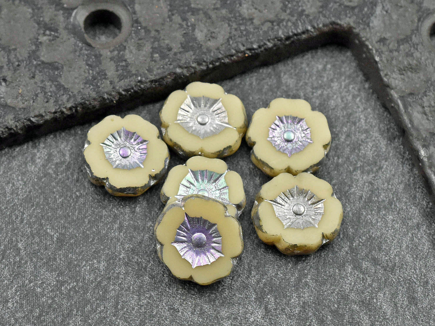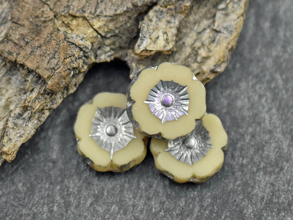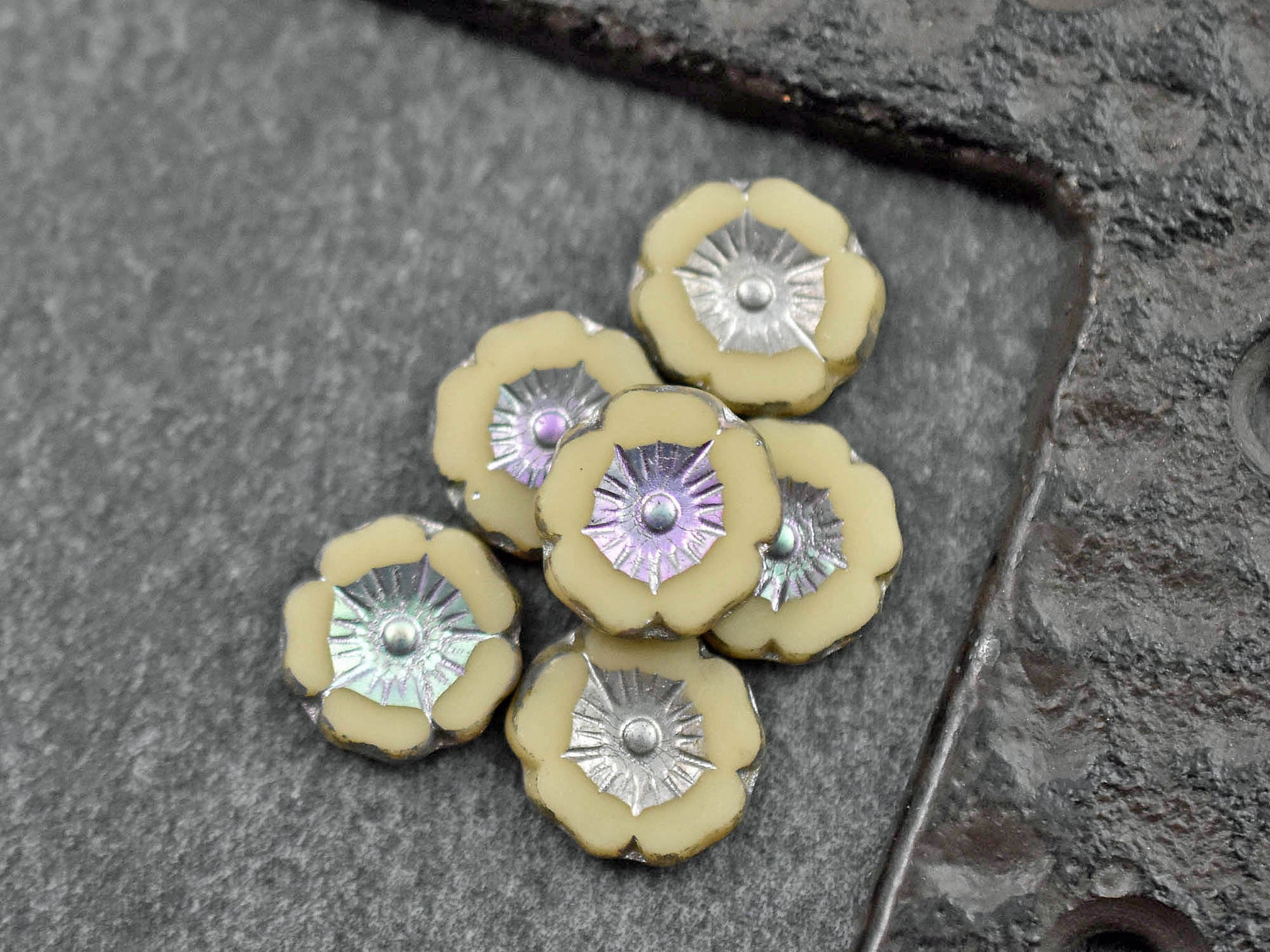 *12* 12mm Antique Silver AB Washed Opaque Ivory Table Cut Hawaiian Flower Beads