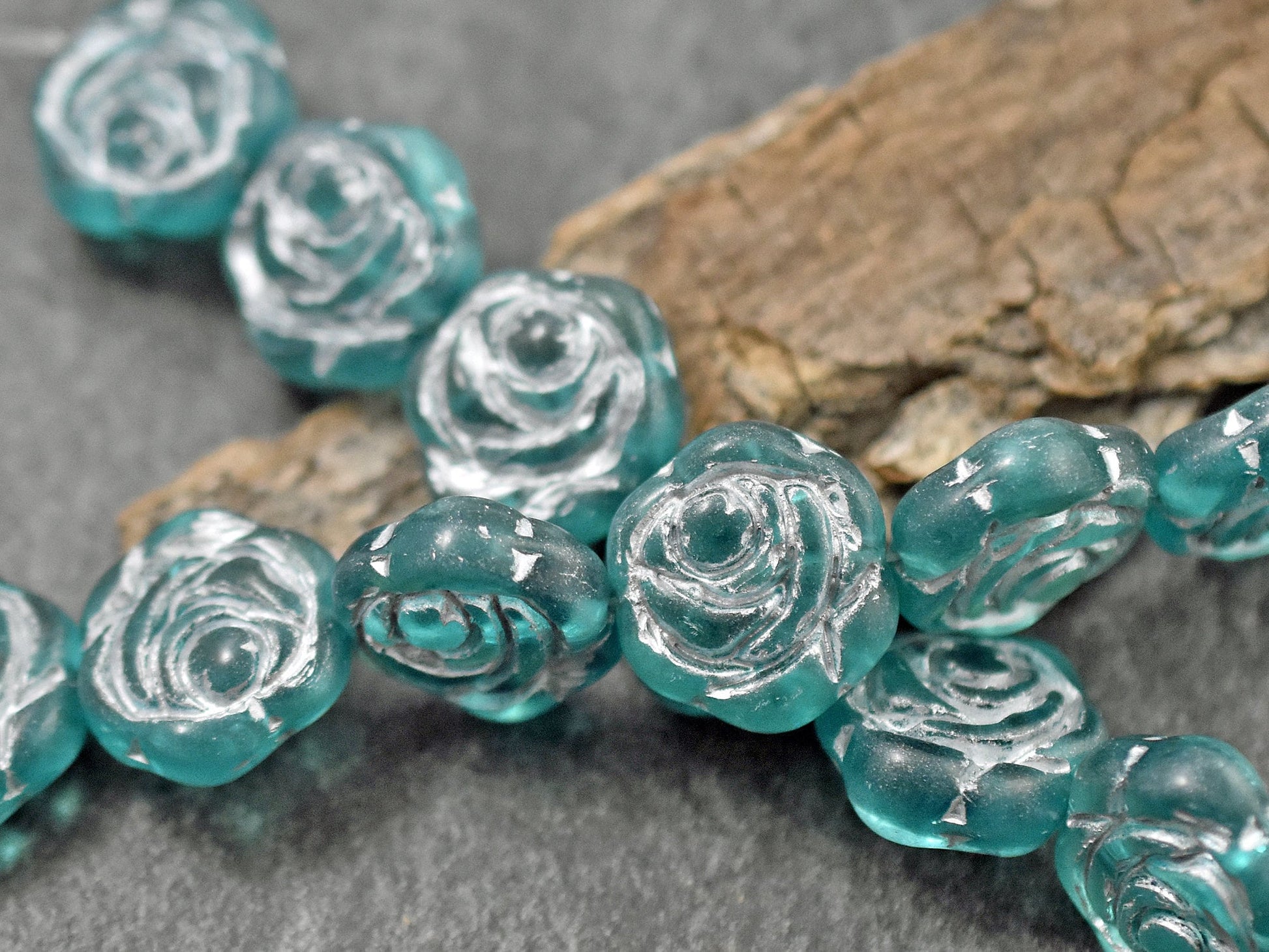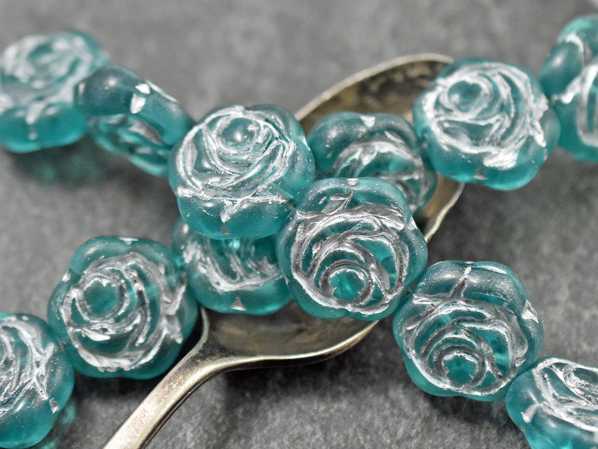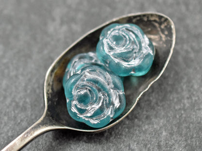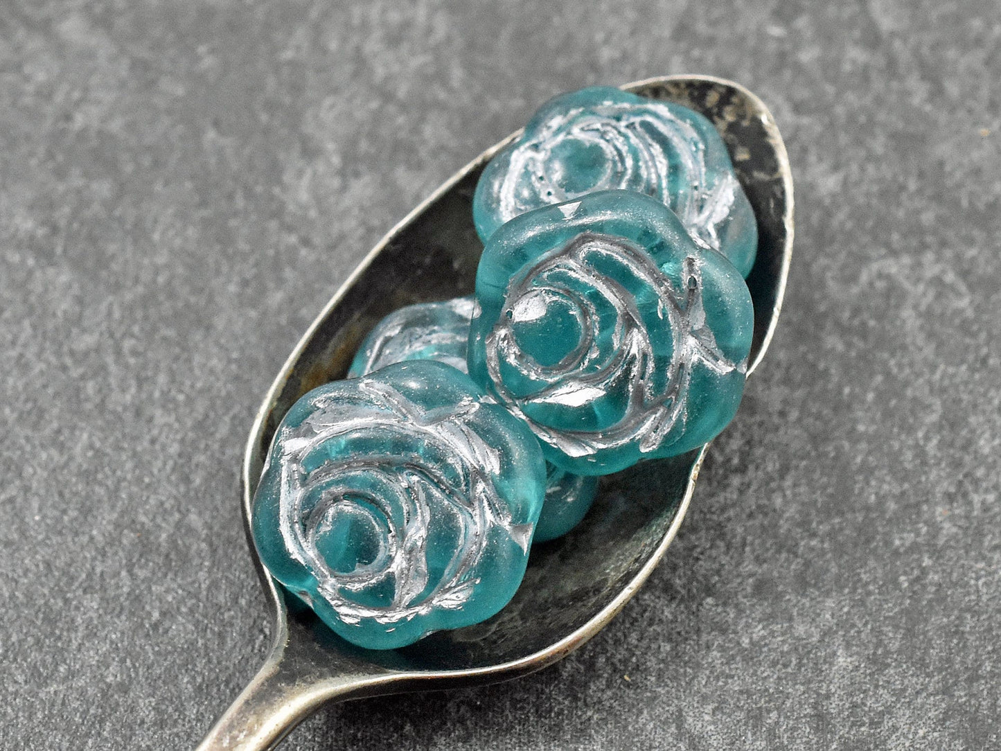 *6* 16mm Silver Washed Green Aqua Rose Flower Coin Beads