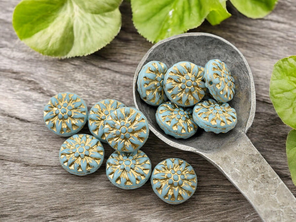 *12* 15mm Gold Washed Sky Blue Turquoise Dahlia Flower Coin Beads