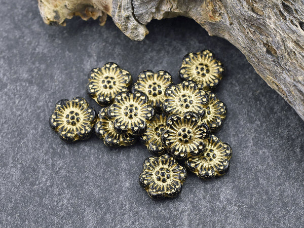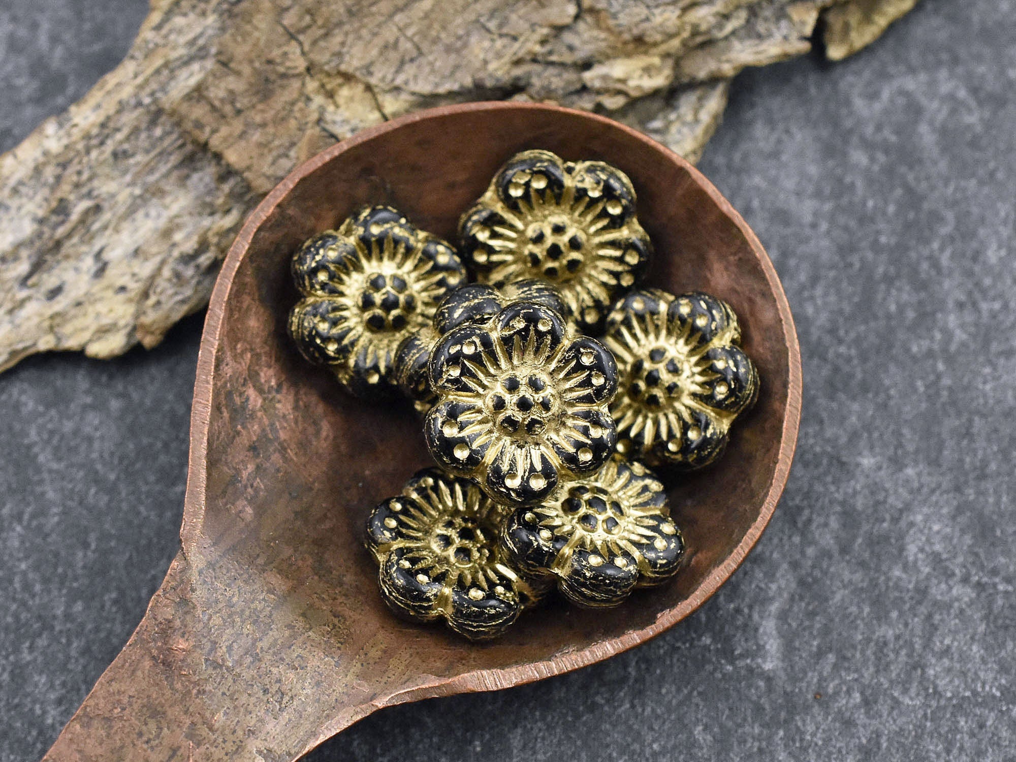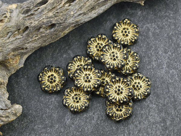 *12* 14mm Gold Washed Jet Black Wildflower Beads