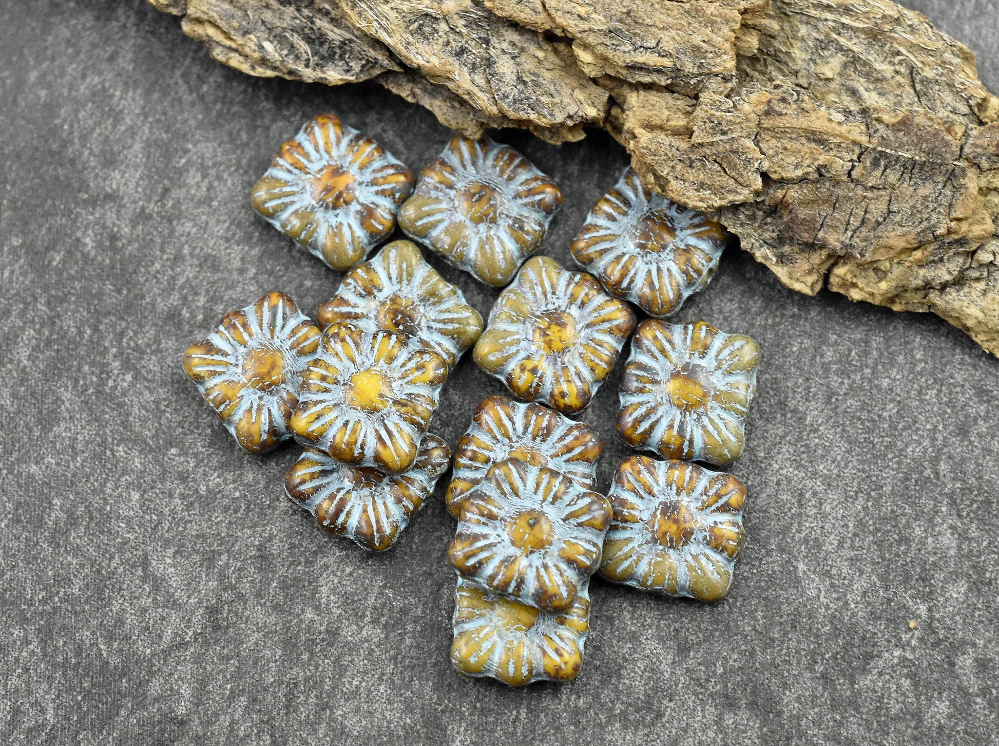 *13* 11mm Turquoise Washed Opaque Mango Travertine Square Zinnia Flower Beads