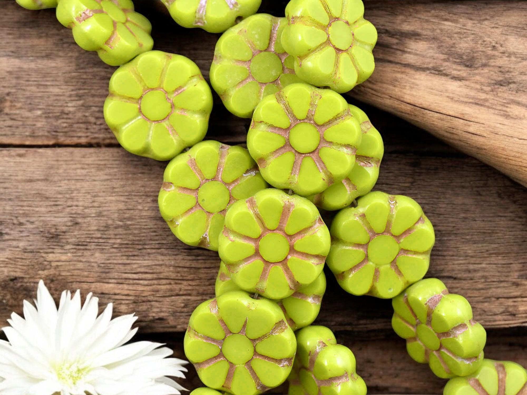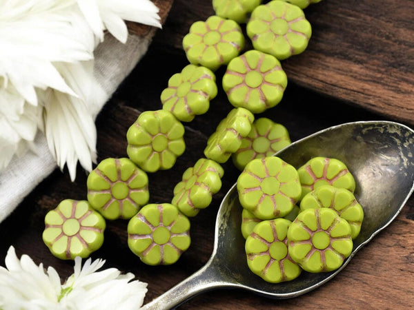 *8* 12mm Bronze Washed Opaque Chartreuse Cosmo Flower Beads