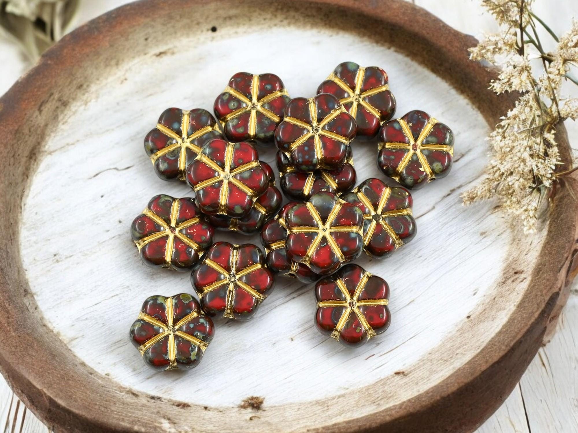 *15* 10mm Gold Washed Opaque Red Travertine Forget Me Not Flower Beads