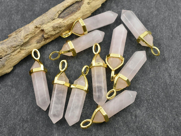 40mm Gold Tone Plated Brass Capped Natural Rose Quartz Double Terminated Bullet Pendant