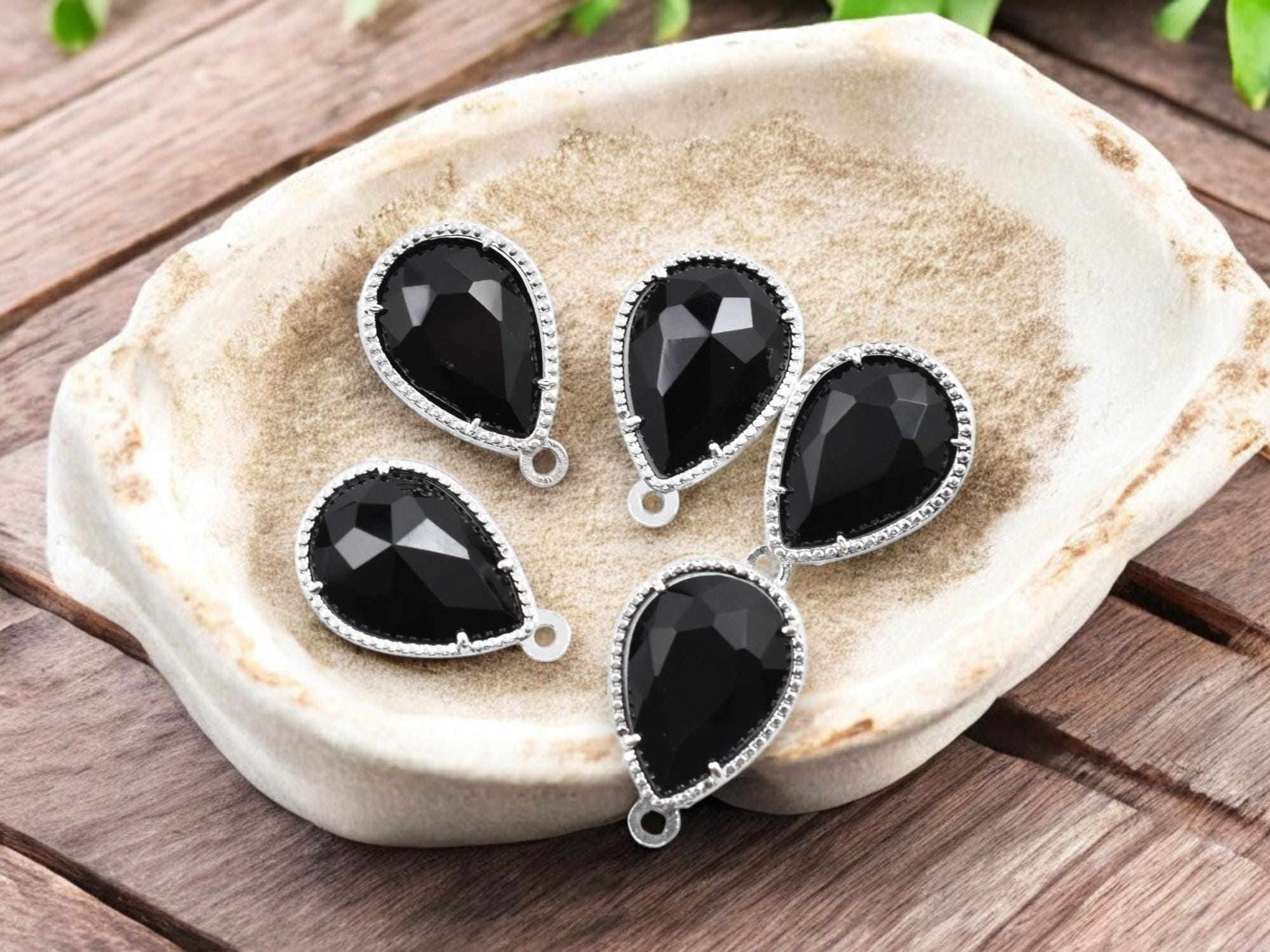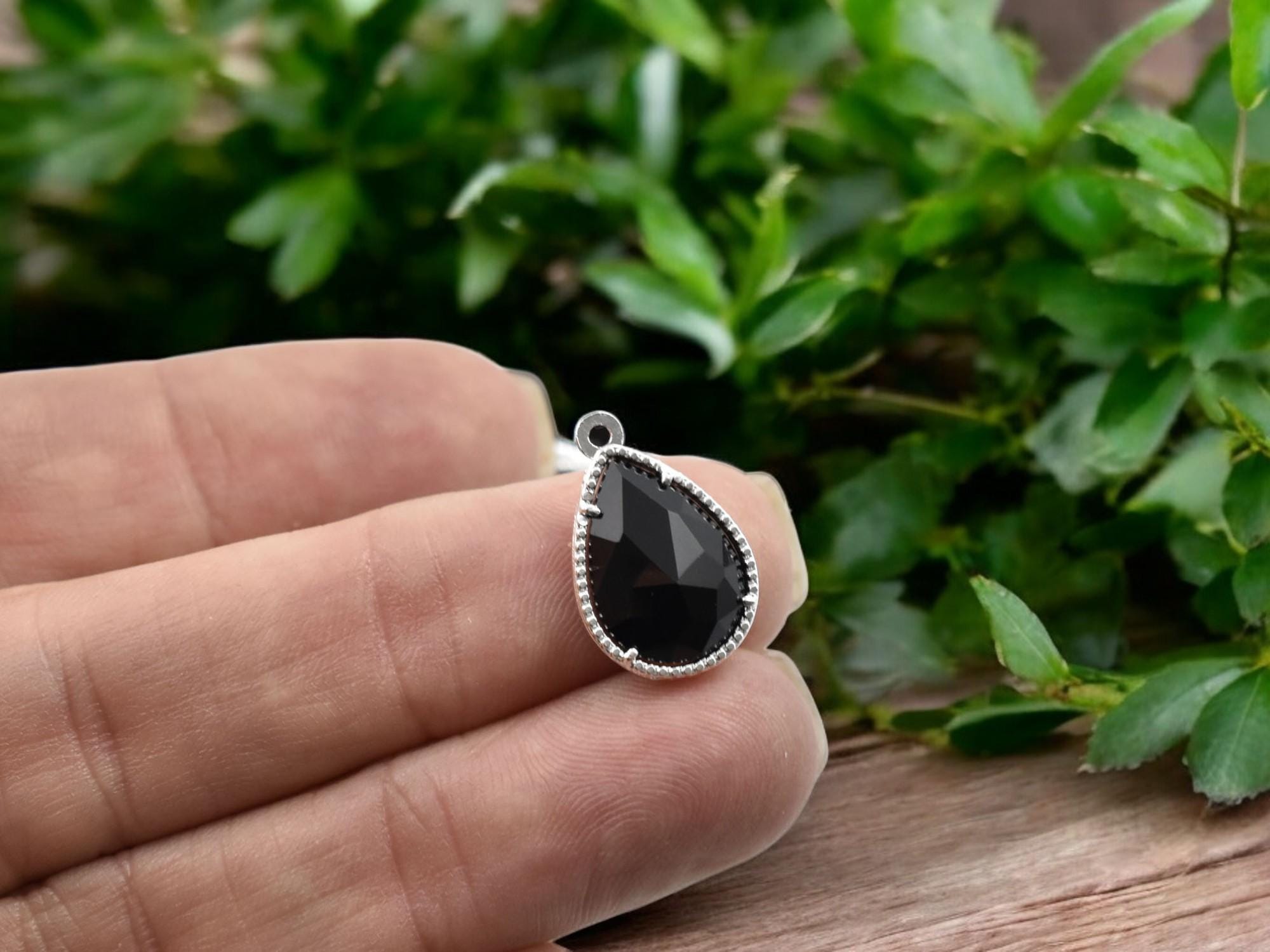 *5* 18x12mm Silver Plated Faceted Black Glass Teardrop Pendants