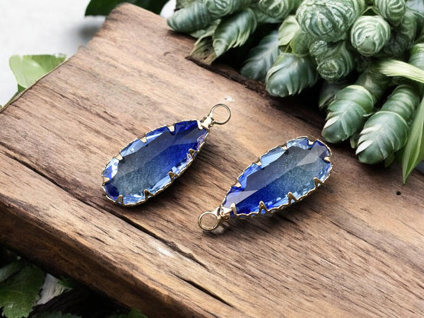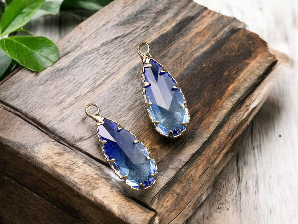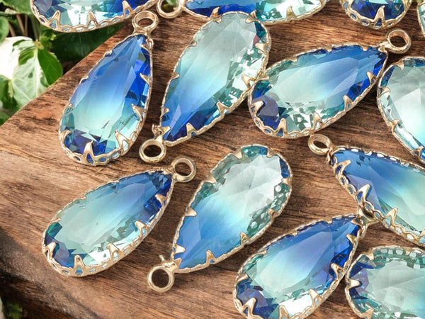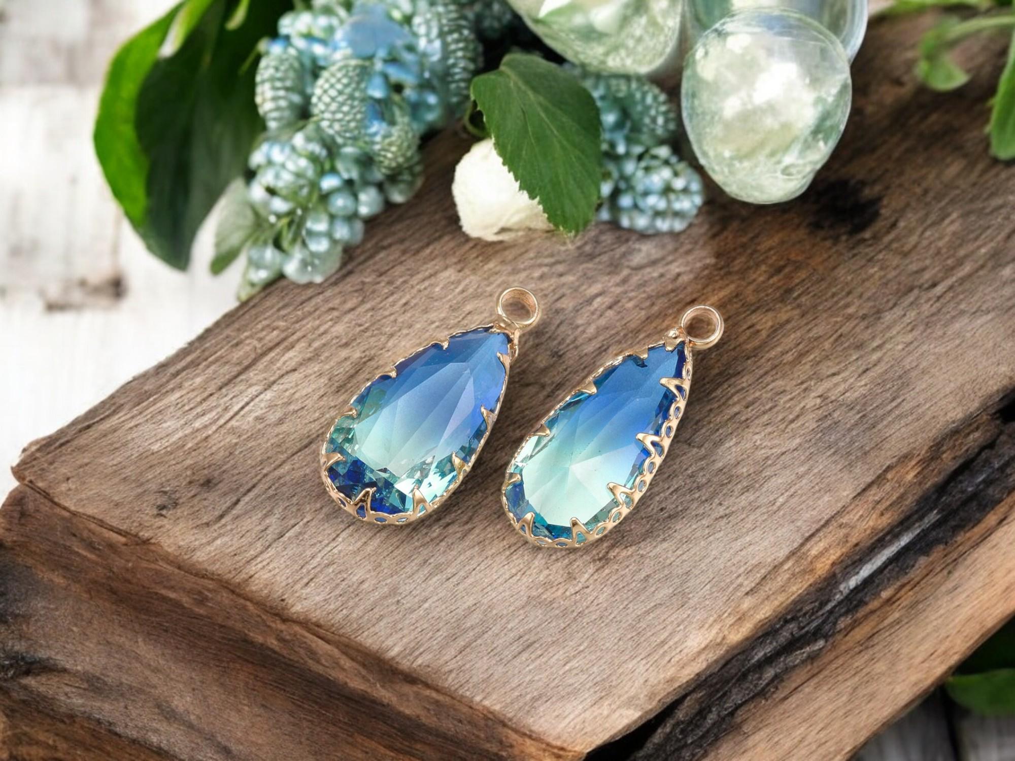 *2* 33x18mm Gold Plated Brass Faceted 2 Tone Blue Aqua Glass Drop Pendants