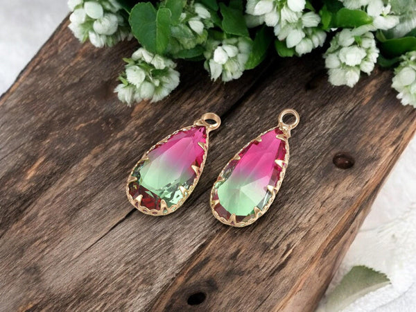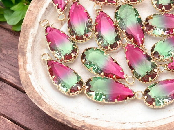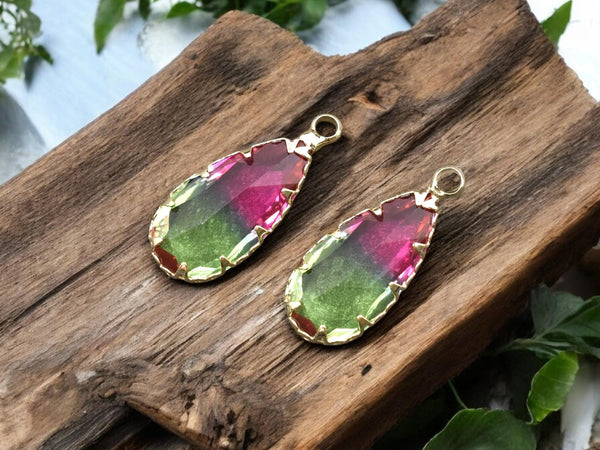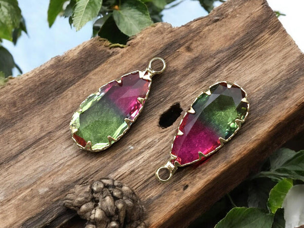 Color: Gold plated brass surrounding faceted 2 tone green fuchsia glass