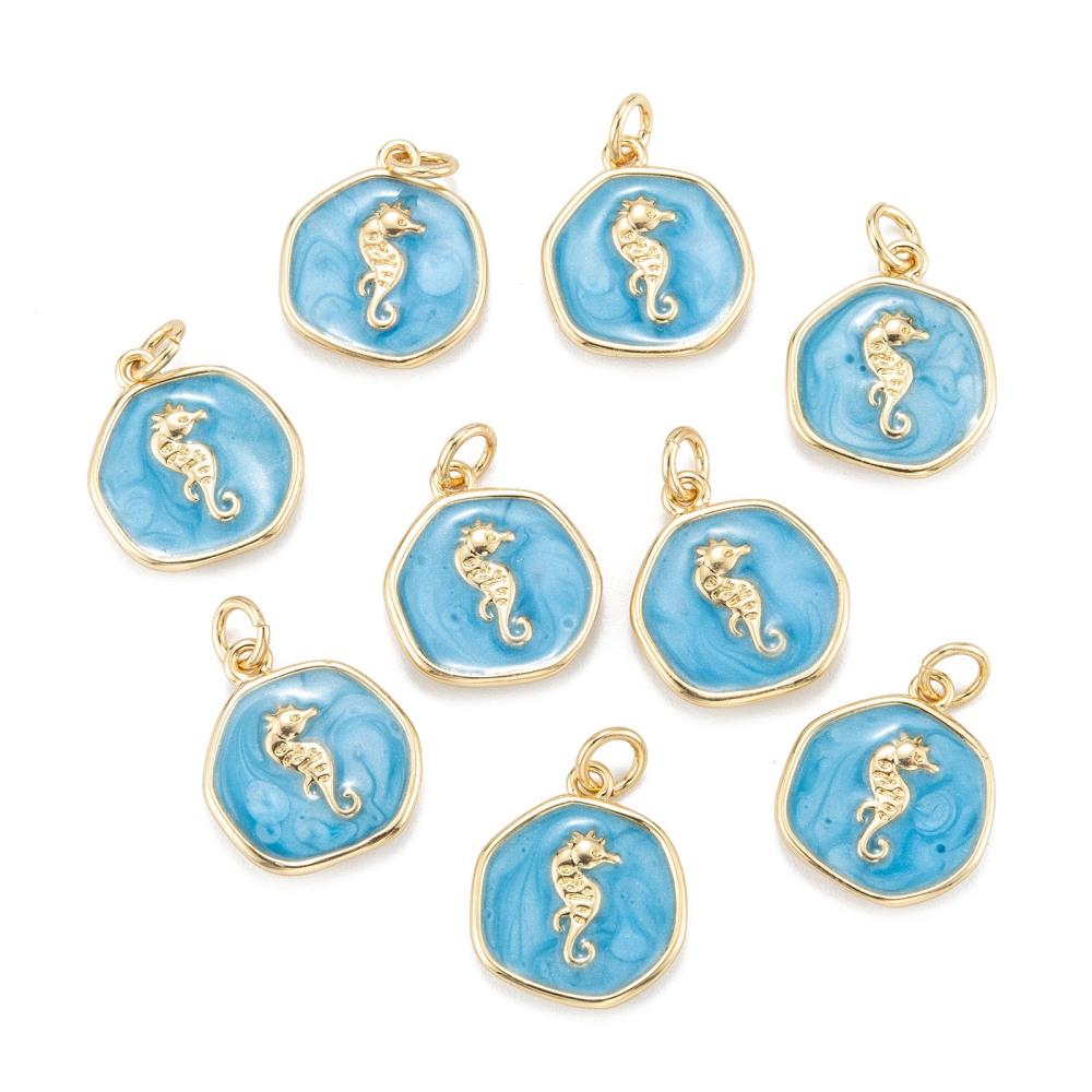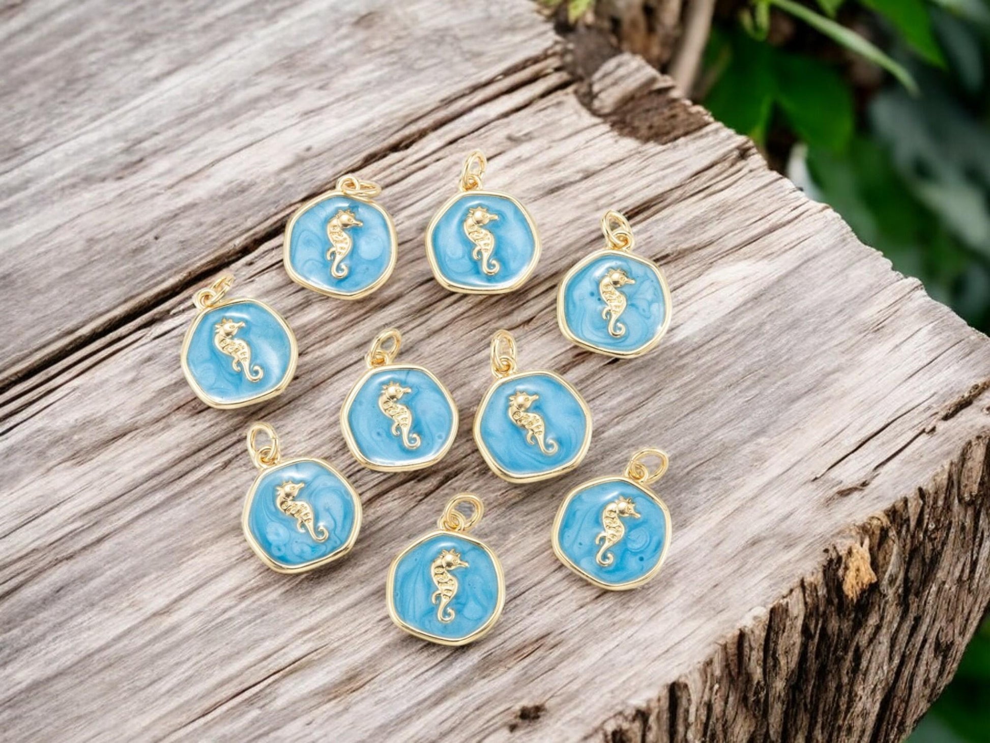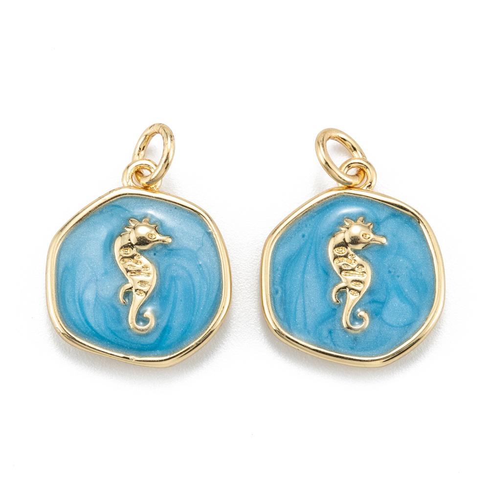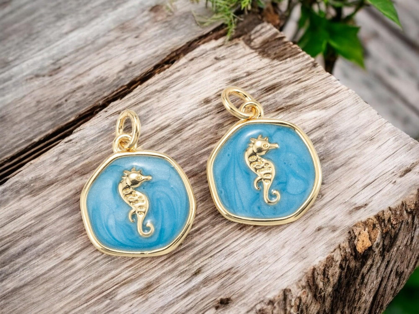 Type/Shape: 18k long lasting gold plated brass w/ blue enamel with seahorse design w/ jump rings