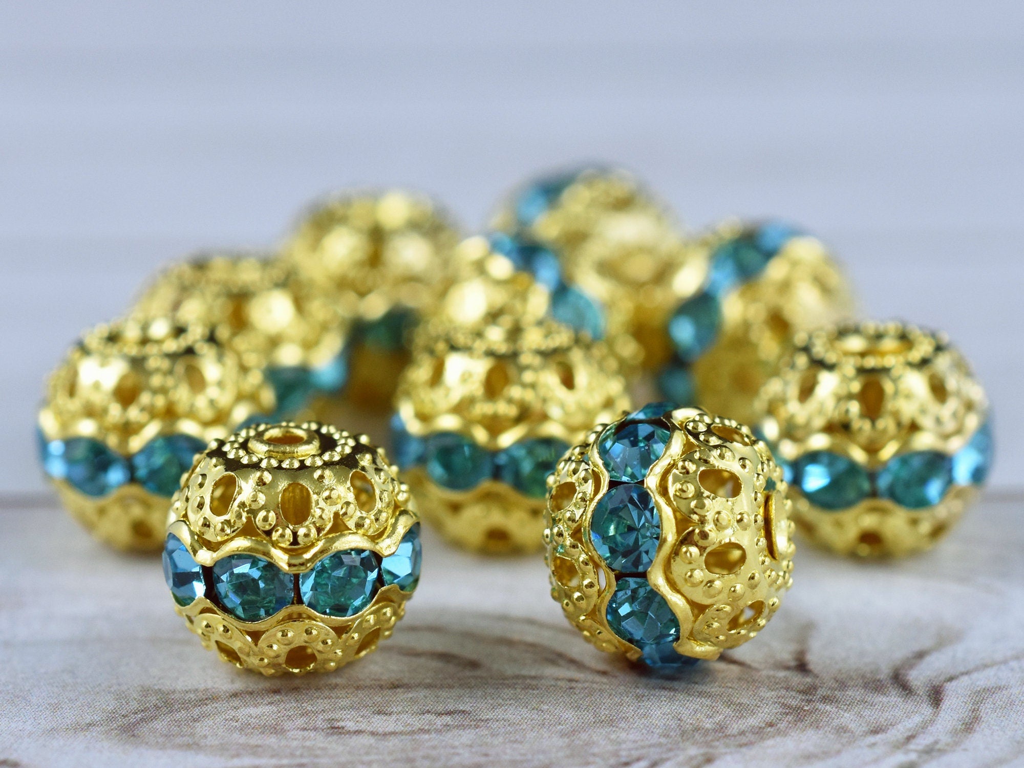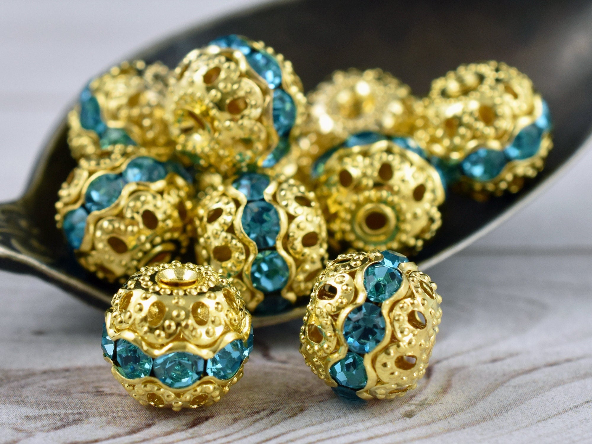 Gold w/Aquamarine Rhinestone Filigree Round Beads -- Choose Your Size