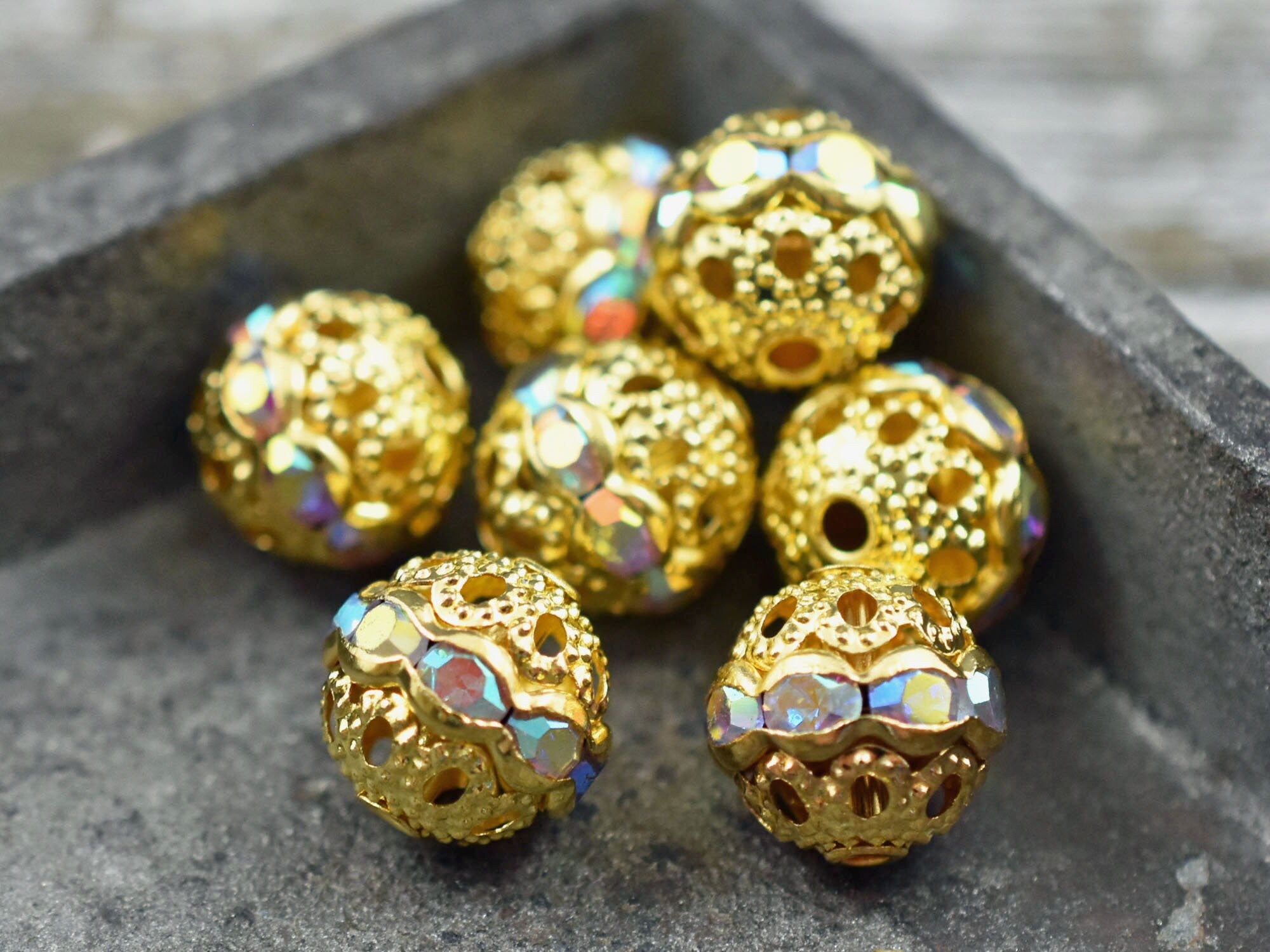 Type/Shape: Filigree round beads with crystal AB rhinestones