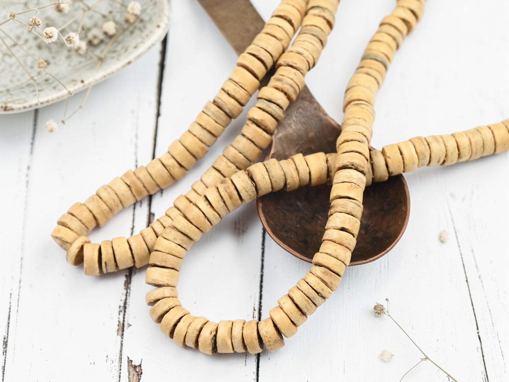 Hand Cut Coconut Shell Natural Wood Heishi Beads (24" Strand) - Choose Your Size