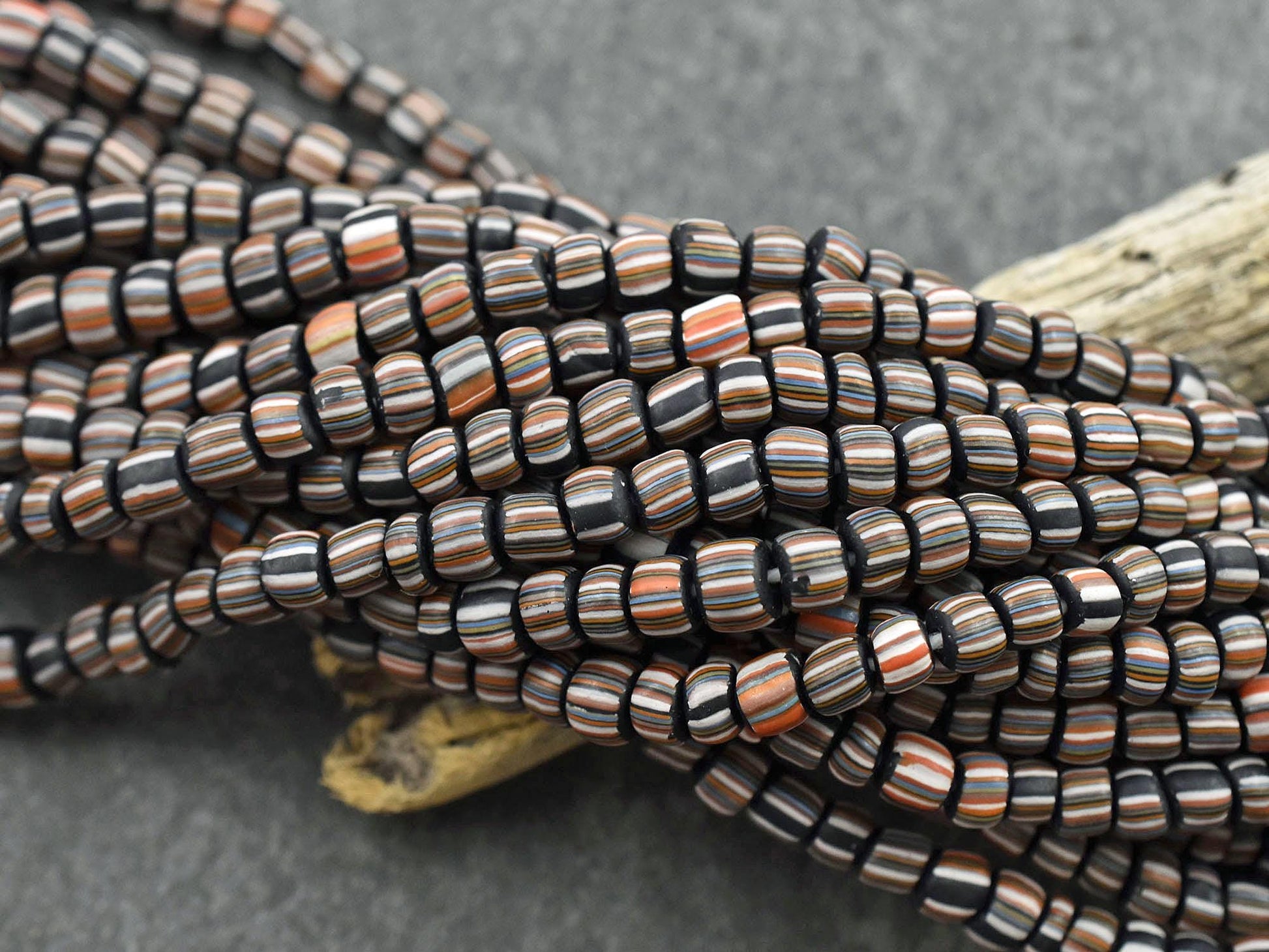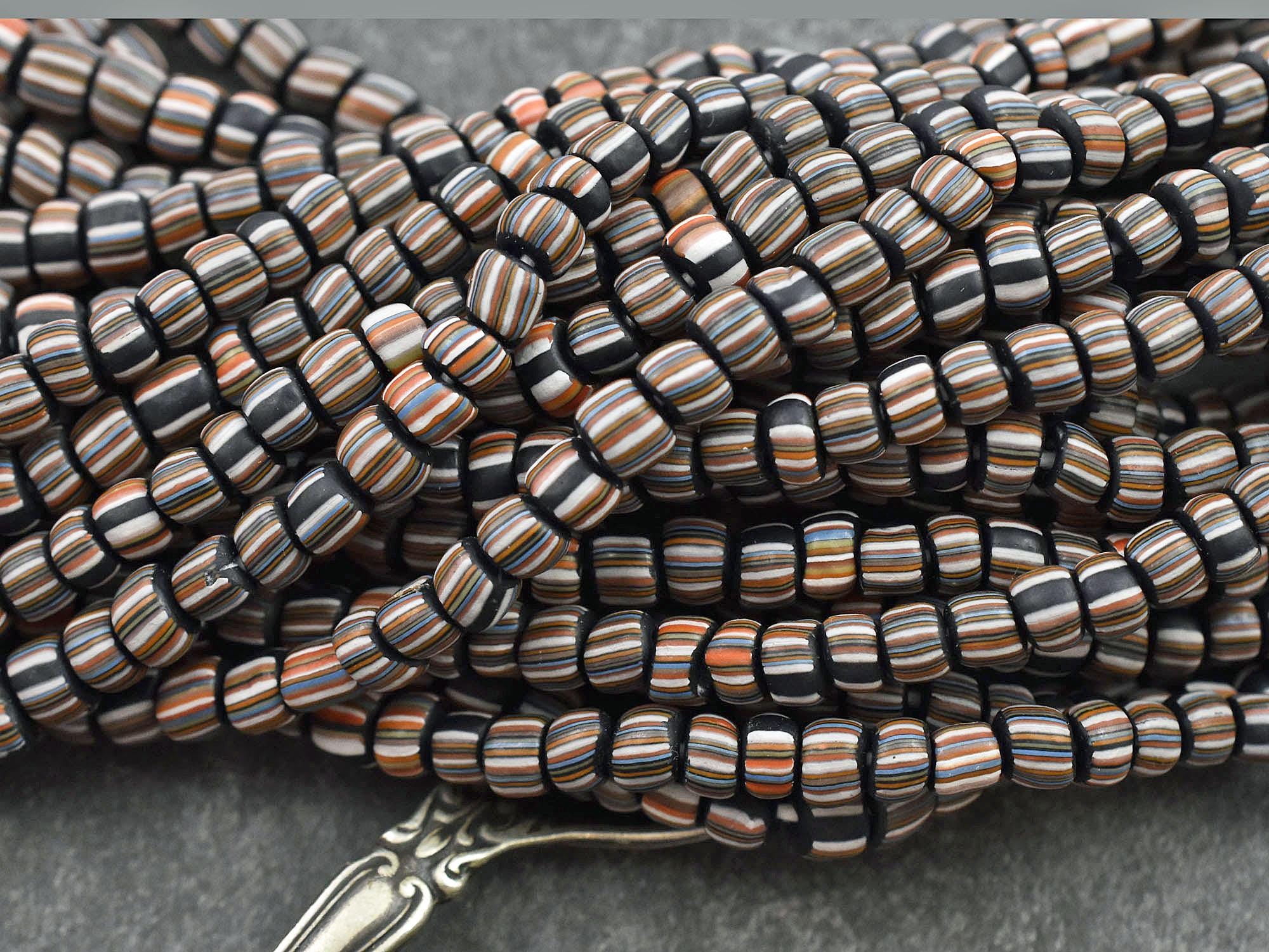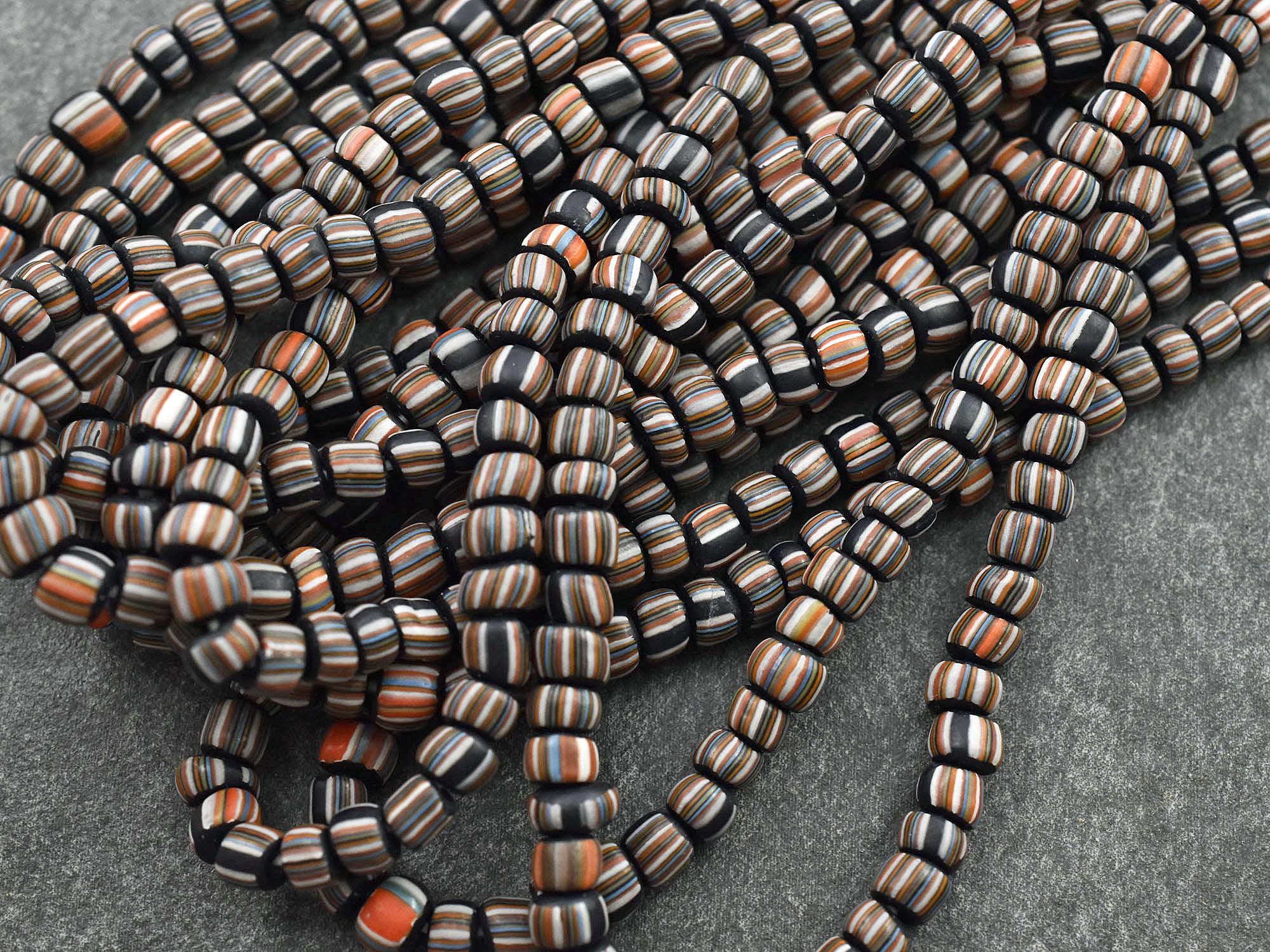 Striped Java Glass Beads. 4-7mm beads. Approx 24" Strands. 6-7 beads per inch.