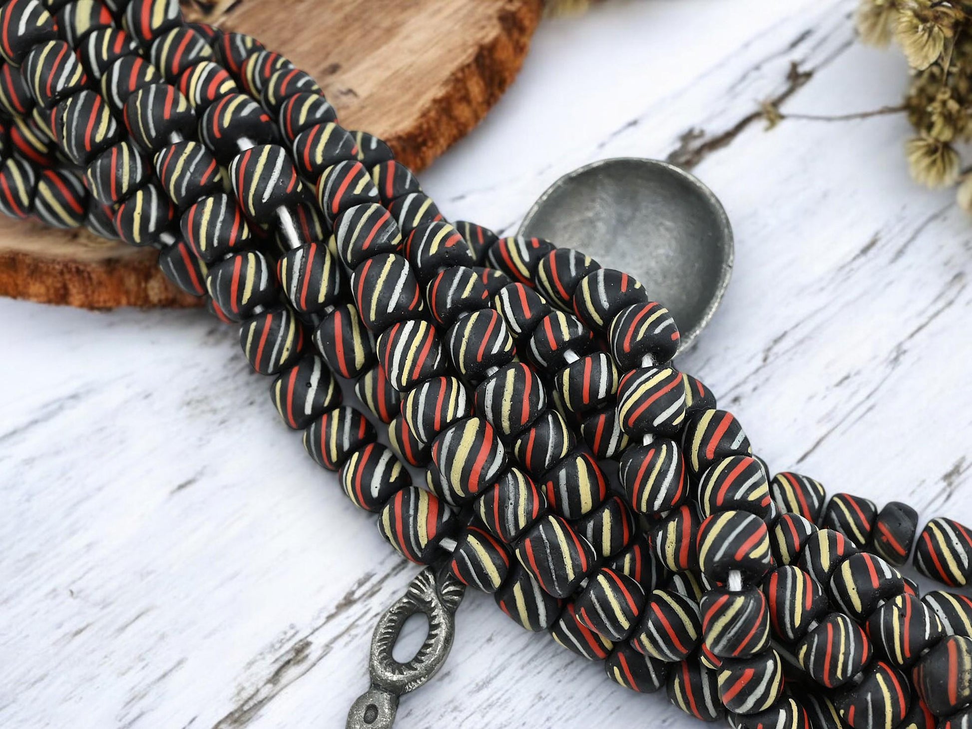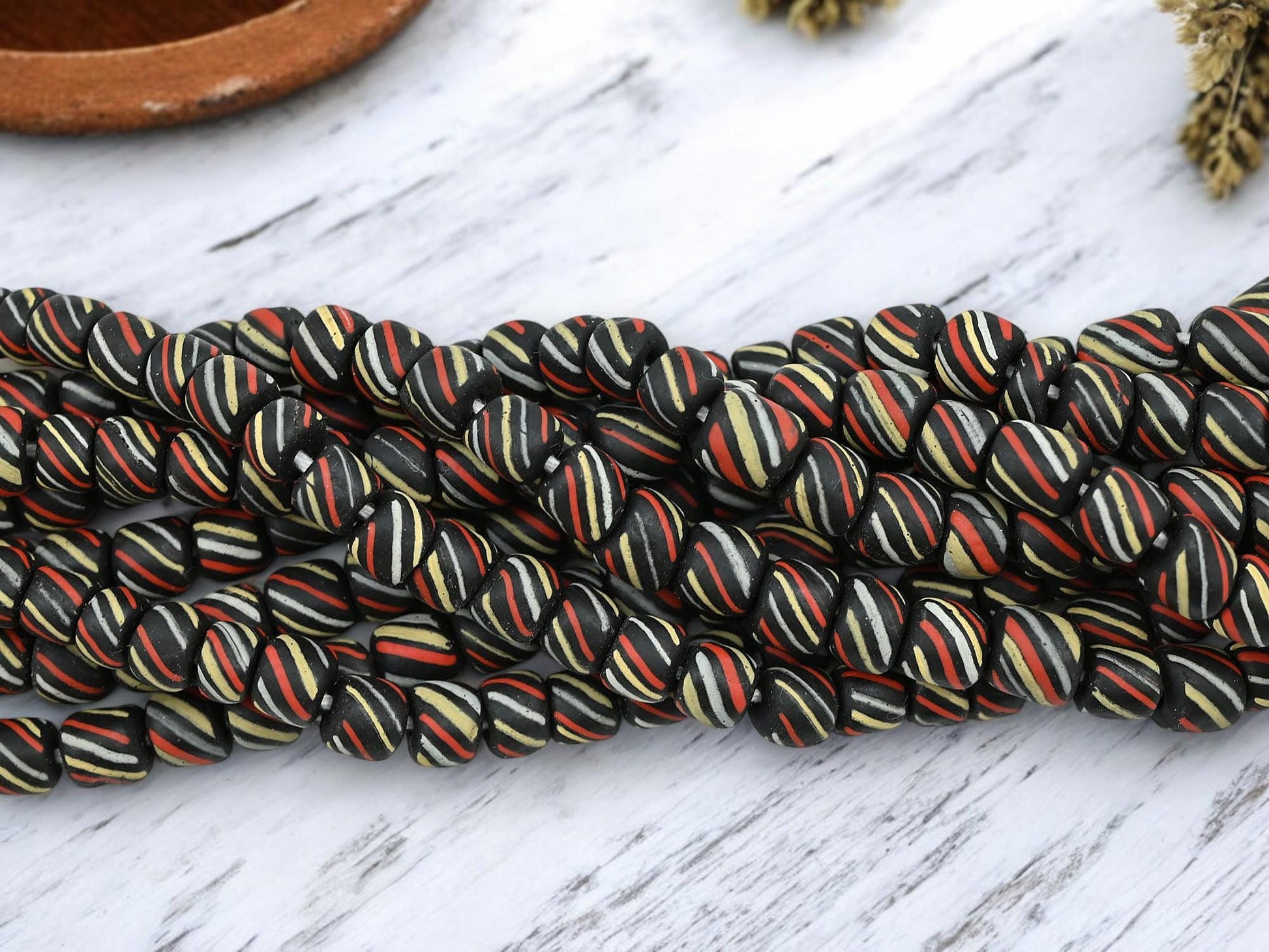 Striped Java Glass Beads. 6-8mm beads. Approx 24" Strands. 4-5 beads per inch
