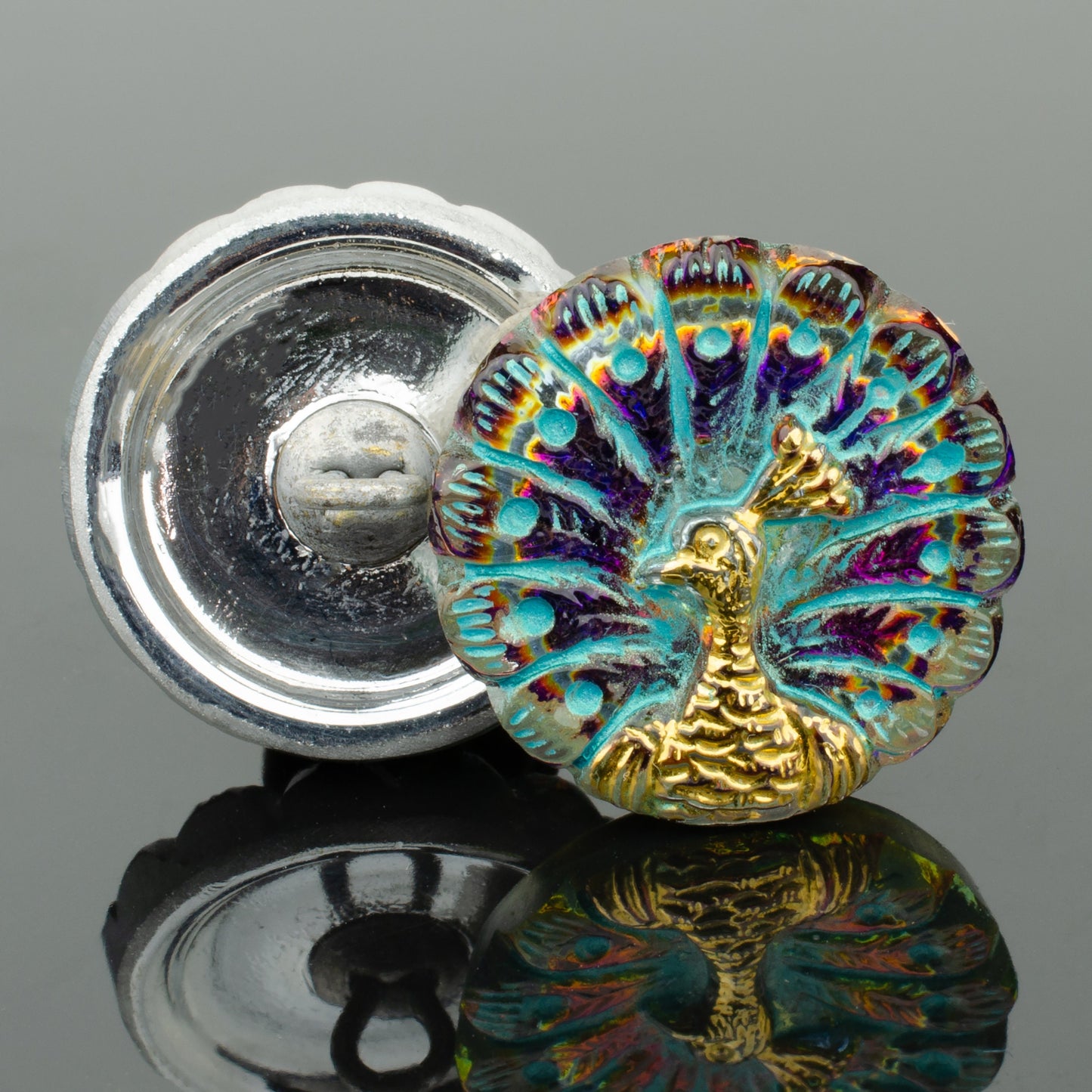 18mm Round Peacock Button - Purple/Pink Iridescent with Turquoise Wash and Gold Paint -- Czech Glass Buttons