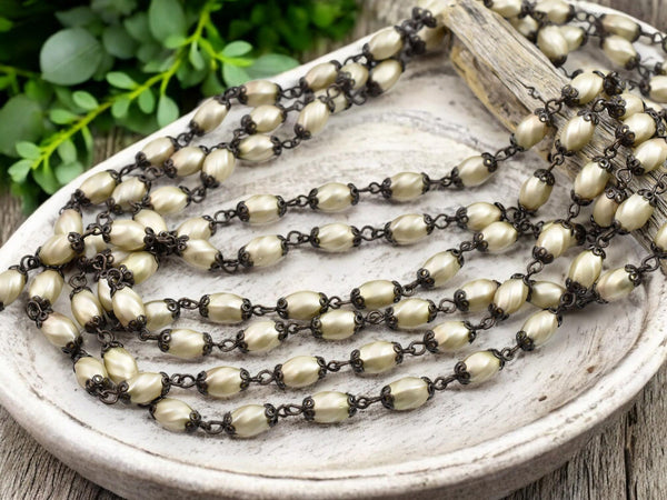 10x6mm Czech Glass Satin Taupe Twisted Oval Pearl Chain w/ Antique Bronze Caps