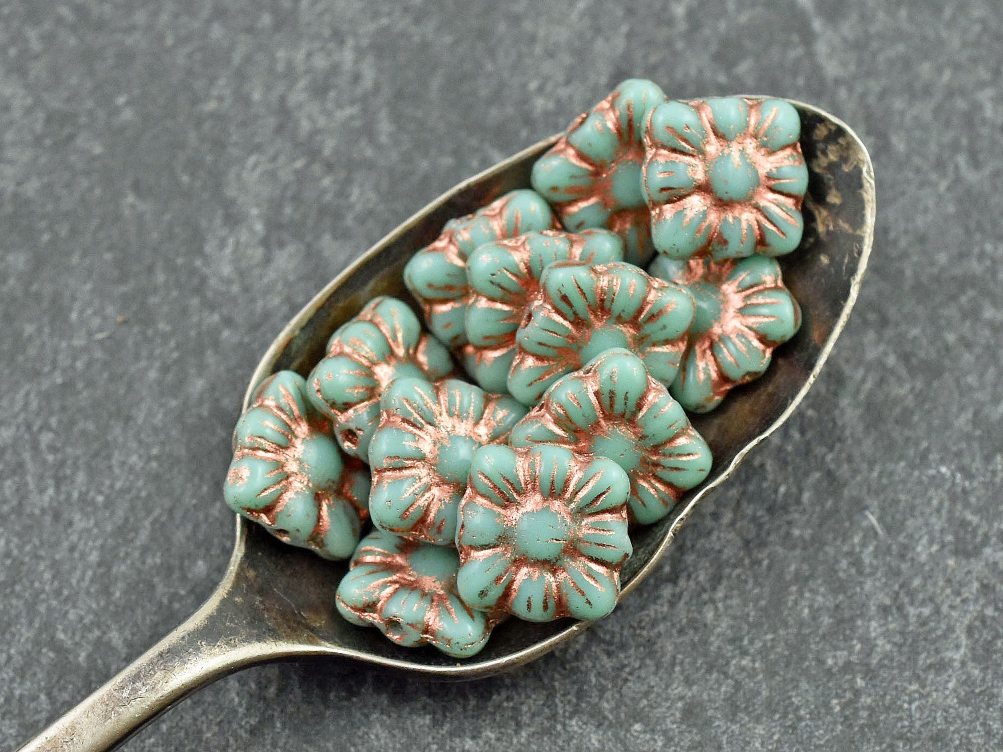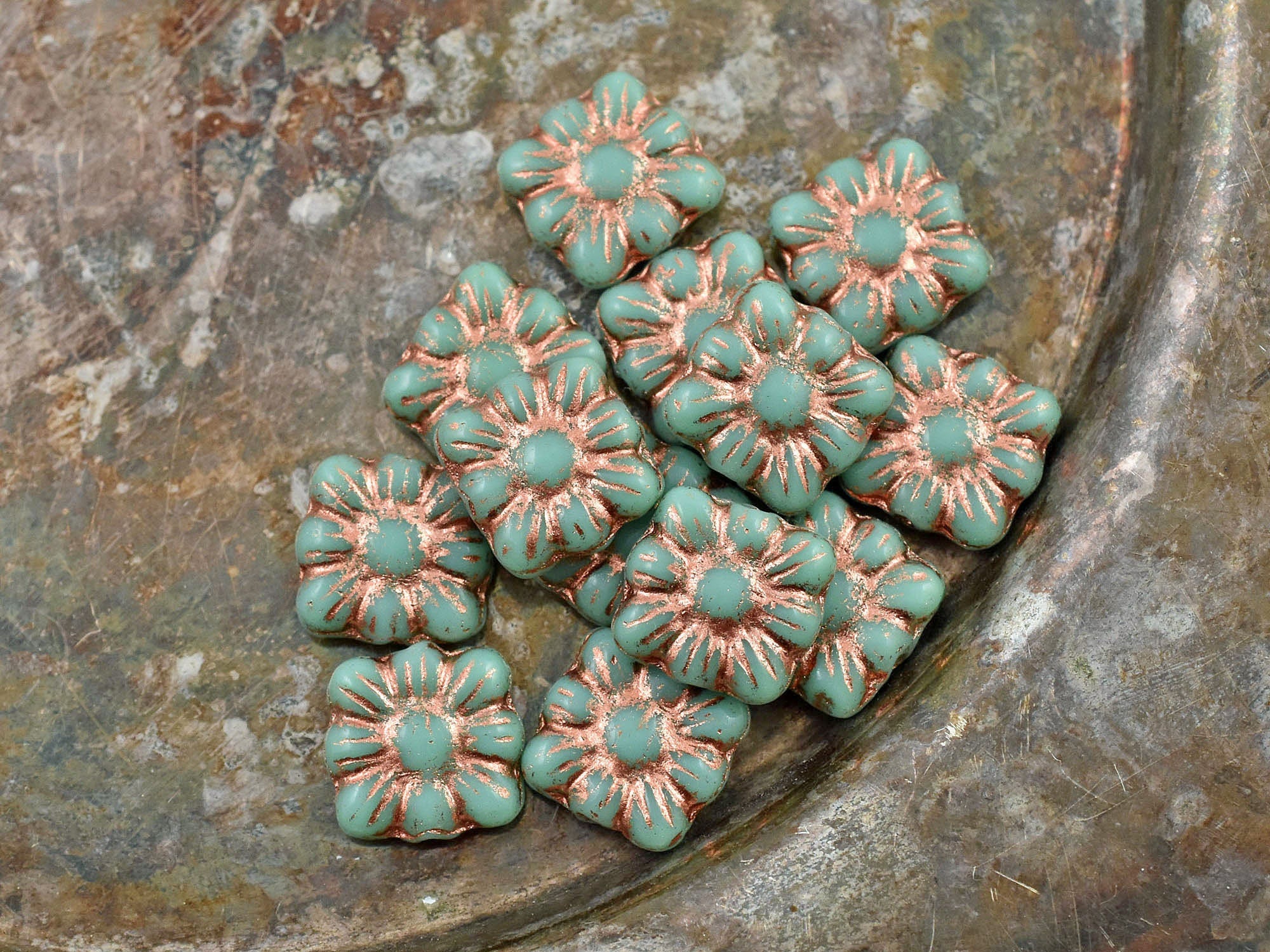 *13* 11mm Copper Washed Opaque Turquoise Square Zinnia Flower Beads