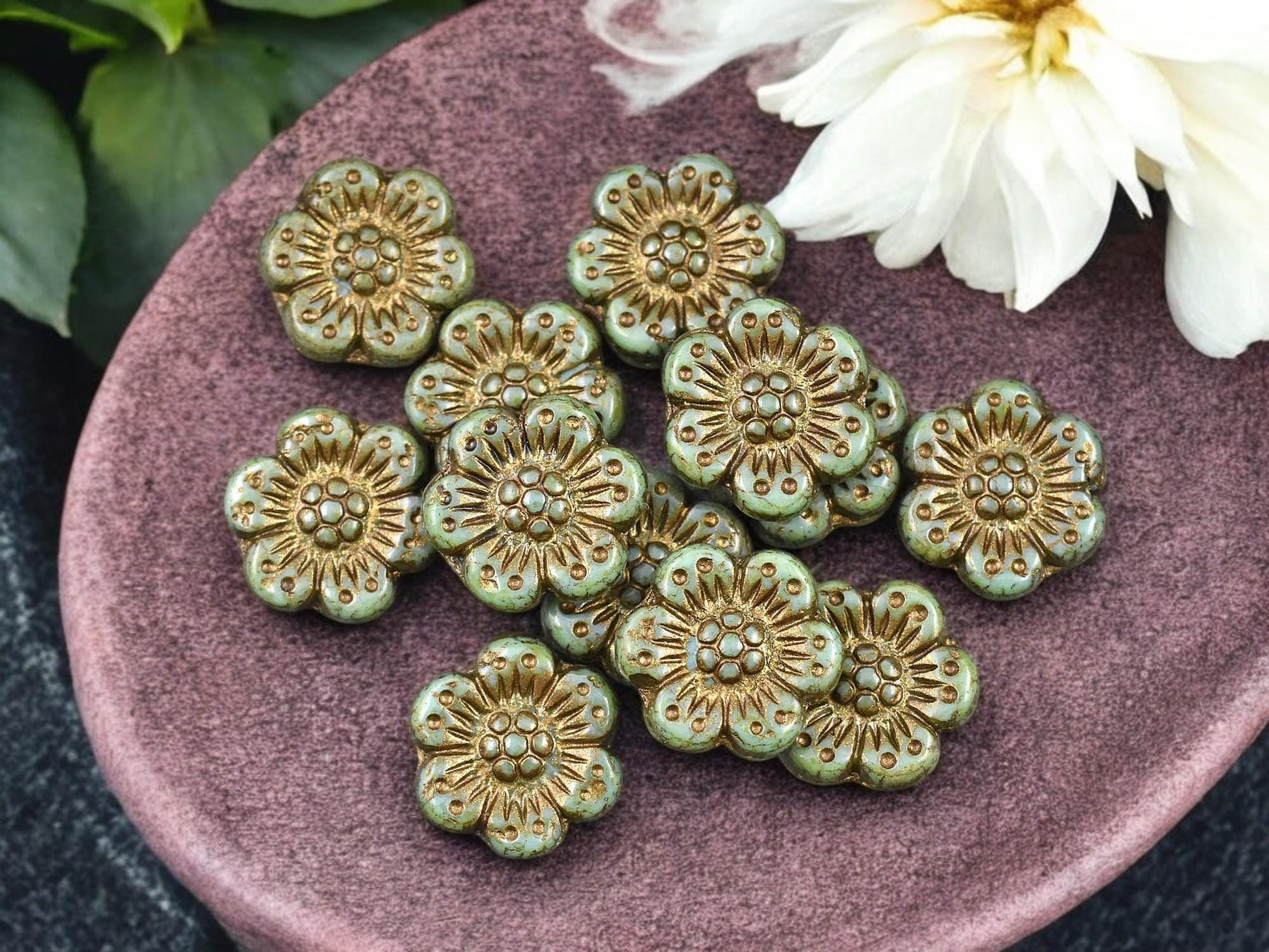 *12* 14mm Dark Bronze Washed Opaque Sage Green Picasso Wildflower Beads