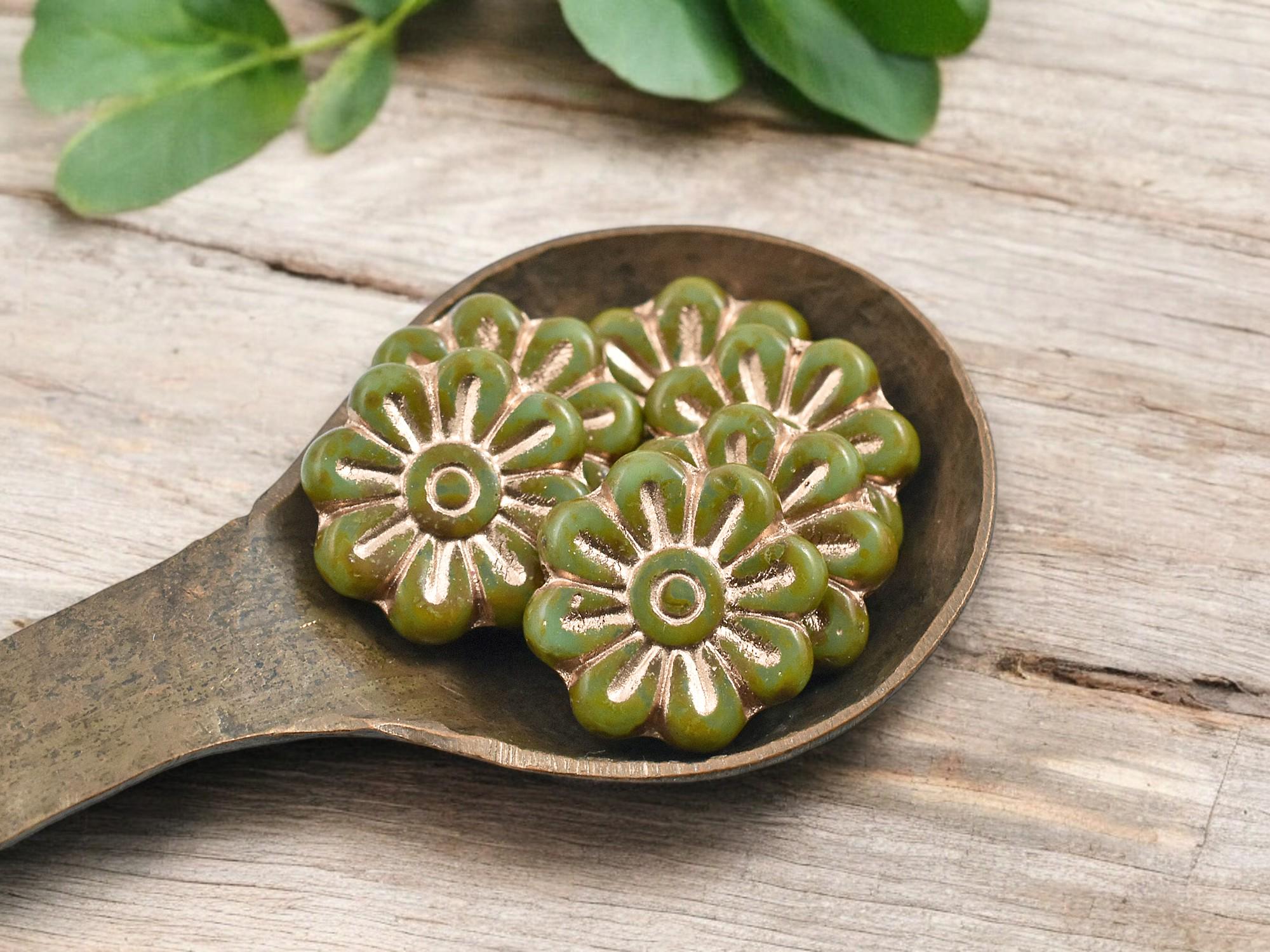 *6* 18mm Copper Washed Opaque Grass Green Daisy Flower Beads