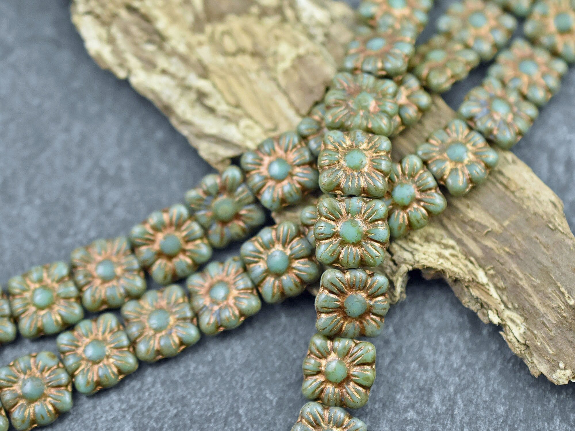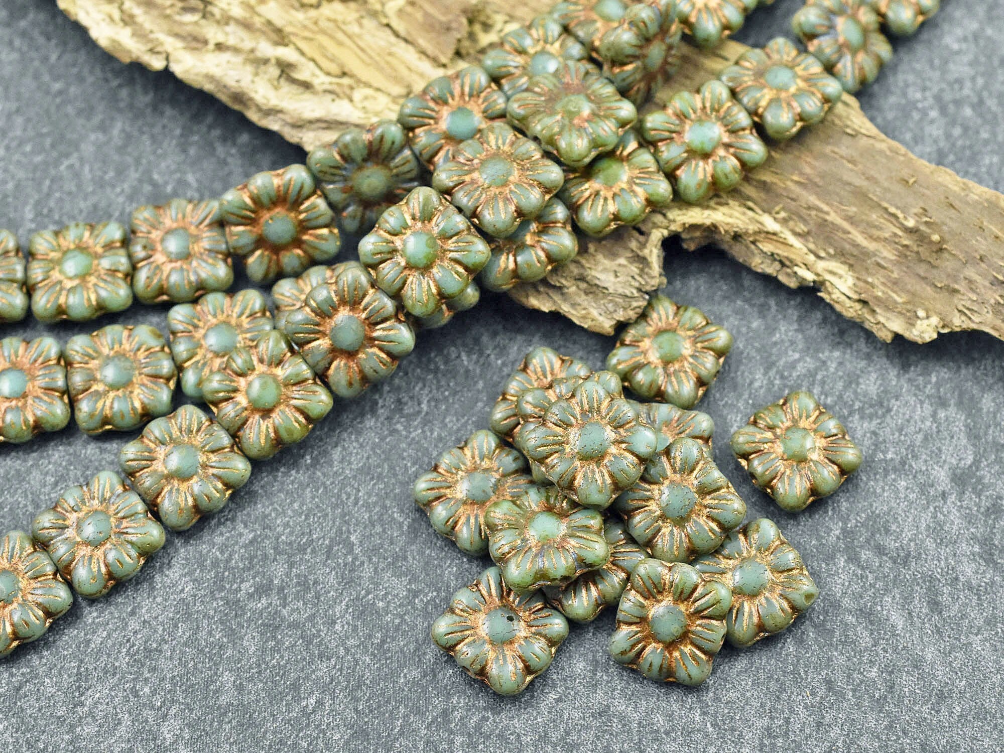 *13* 11mm Bronze Washed Opaque Turquoise Travertine Square Zinnia Flower Beads