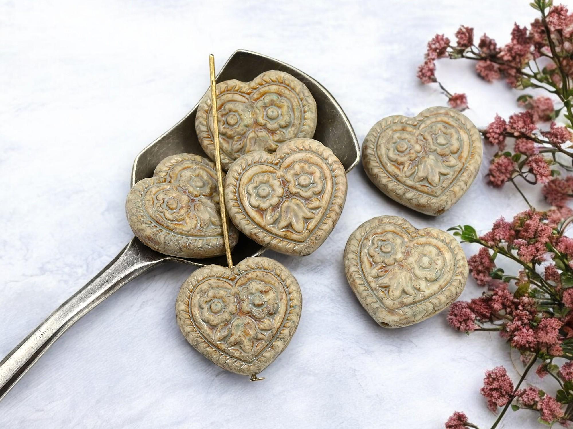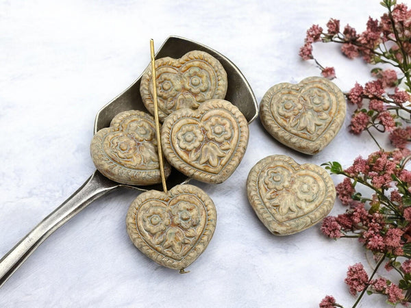 *6* 17mm Opaque Oyster Travertine Floral Heart Beads