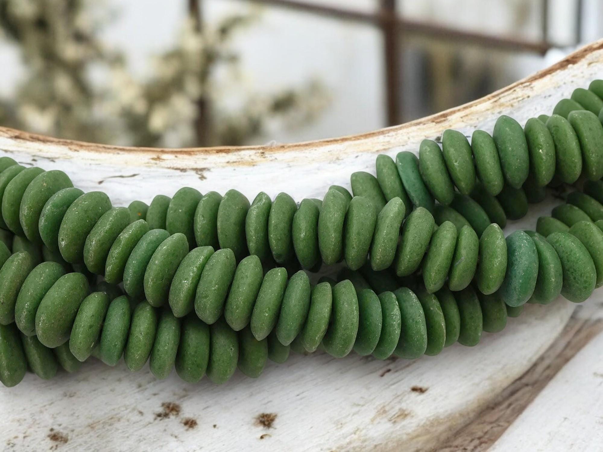 Enhance your jewelry designs with these stunning fern green African recycled glass beads. Handmade using traditional techniques, these eco-friendly, donut-shaped beads add a unique and organic touch to beaded crafts, DIY projects, and artisanal jewelry. Their smooth yet textured finish makes them perfect for bohemian, tribal, and rustic-inspired creations. Grab these high-quality African trade beads today!