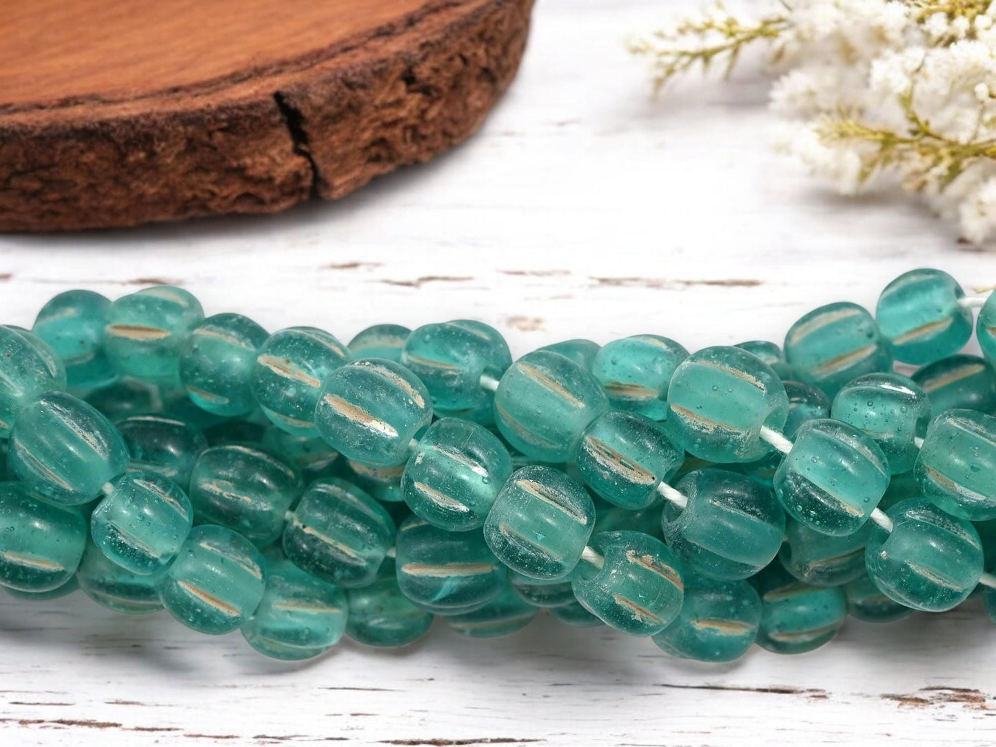 ♥ Pompeii "melon" beads – antiqued glass. 24″ Strands. Approx. 9-11mm. A lot of variation in size and finish is to be expected in these beads. These beads are handmade on the island of Java in Indonesia. Due to the handmade nature of the beads color and size will vary.