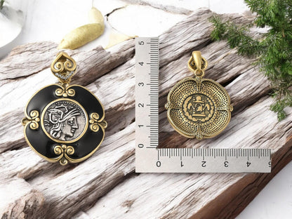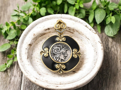 Type/Shape: Greek coin replica style pendant with black enamel and cubic zirconia