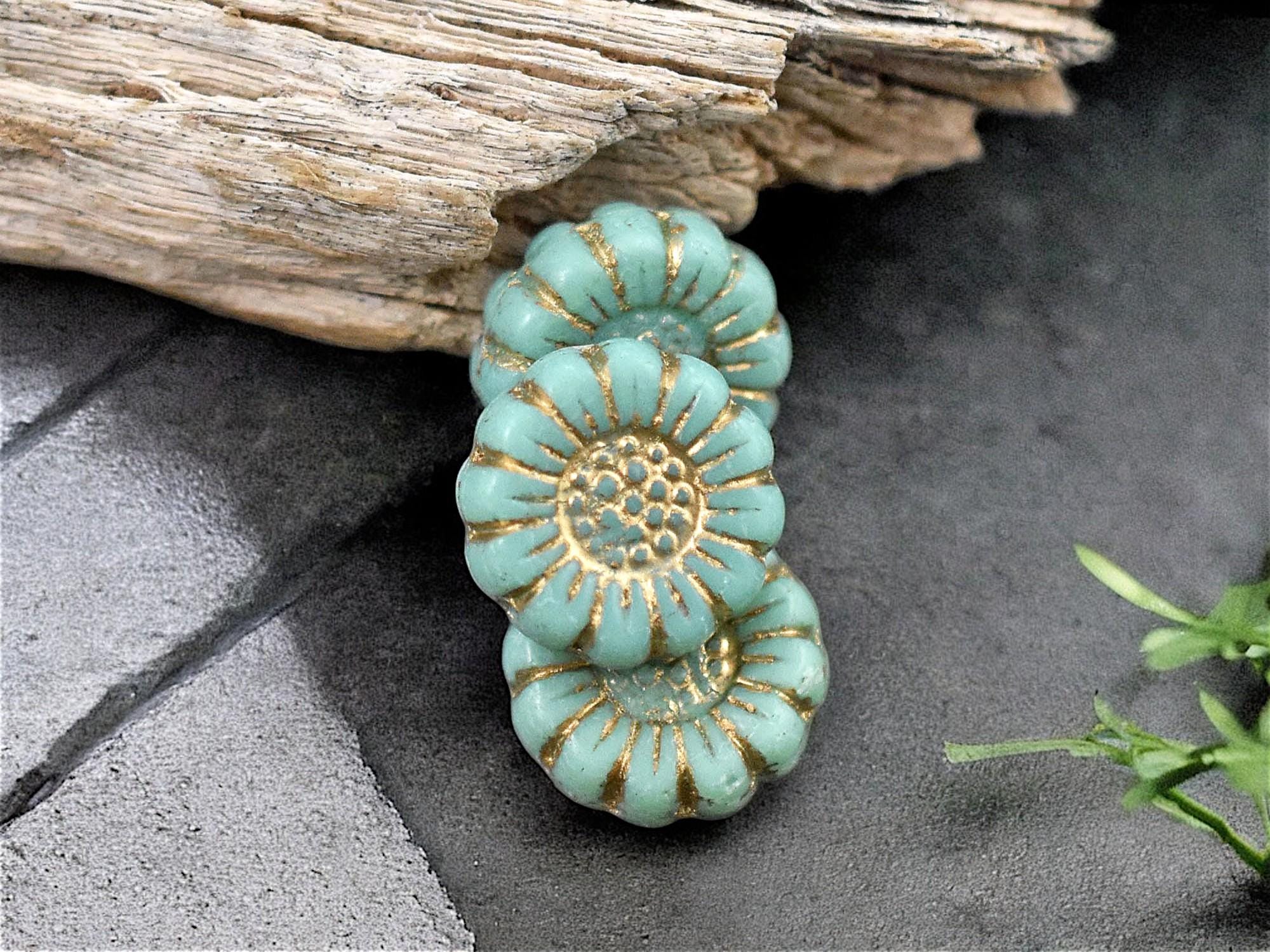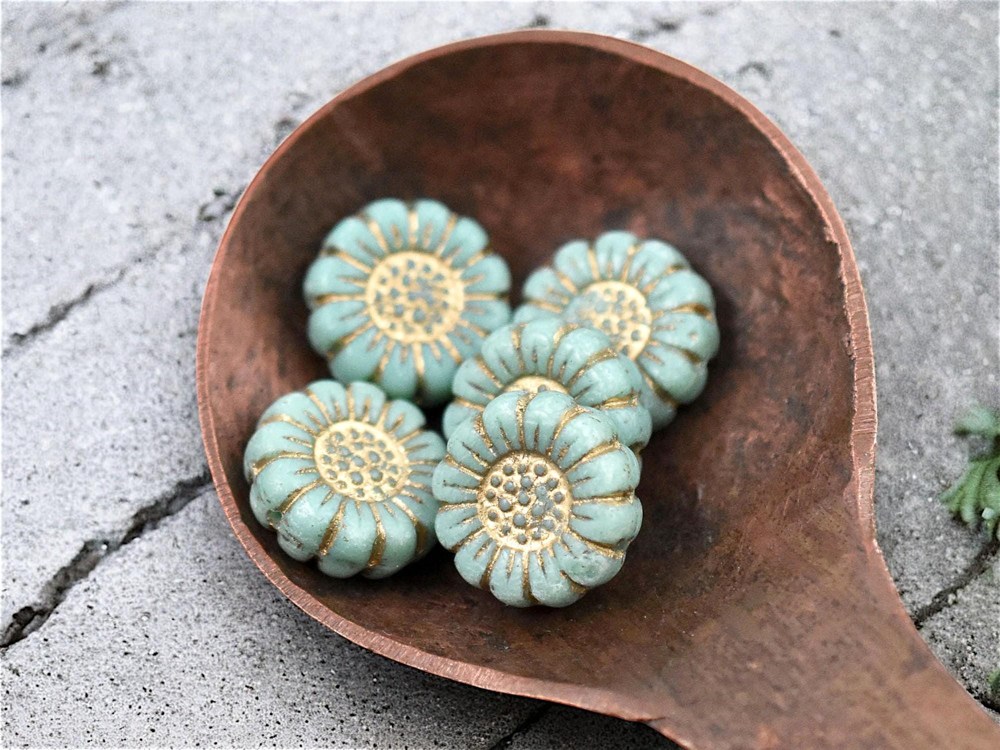 *12* 13mm Gold Washed Opaque Turquoise Sunflower Coin Beads