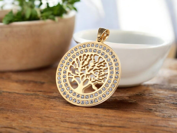 40mm Gold Plated Stainless Steel Rhinestone Tree of LIfe Pendant