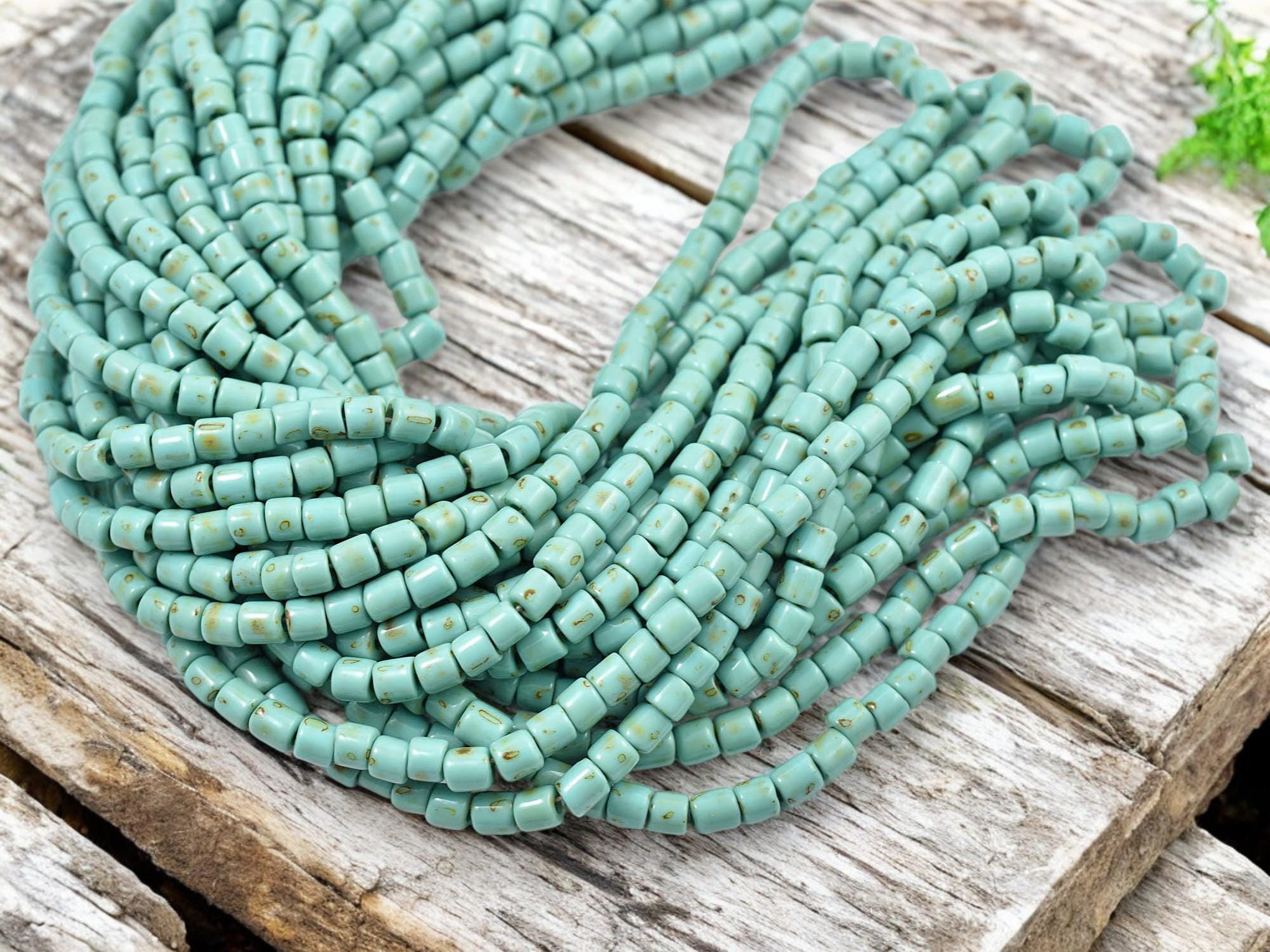 6/0 Aged Green Turquoise Picasso Tube Beads (20" Strand)
